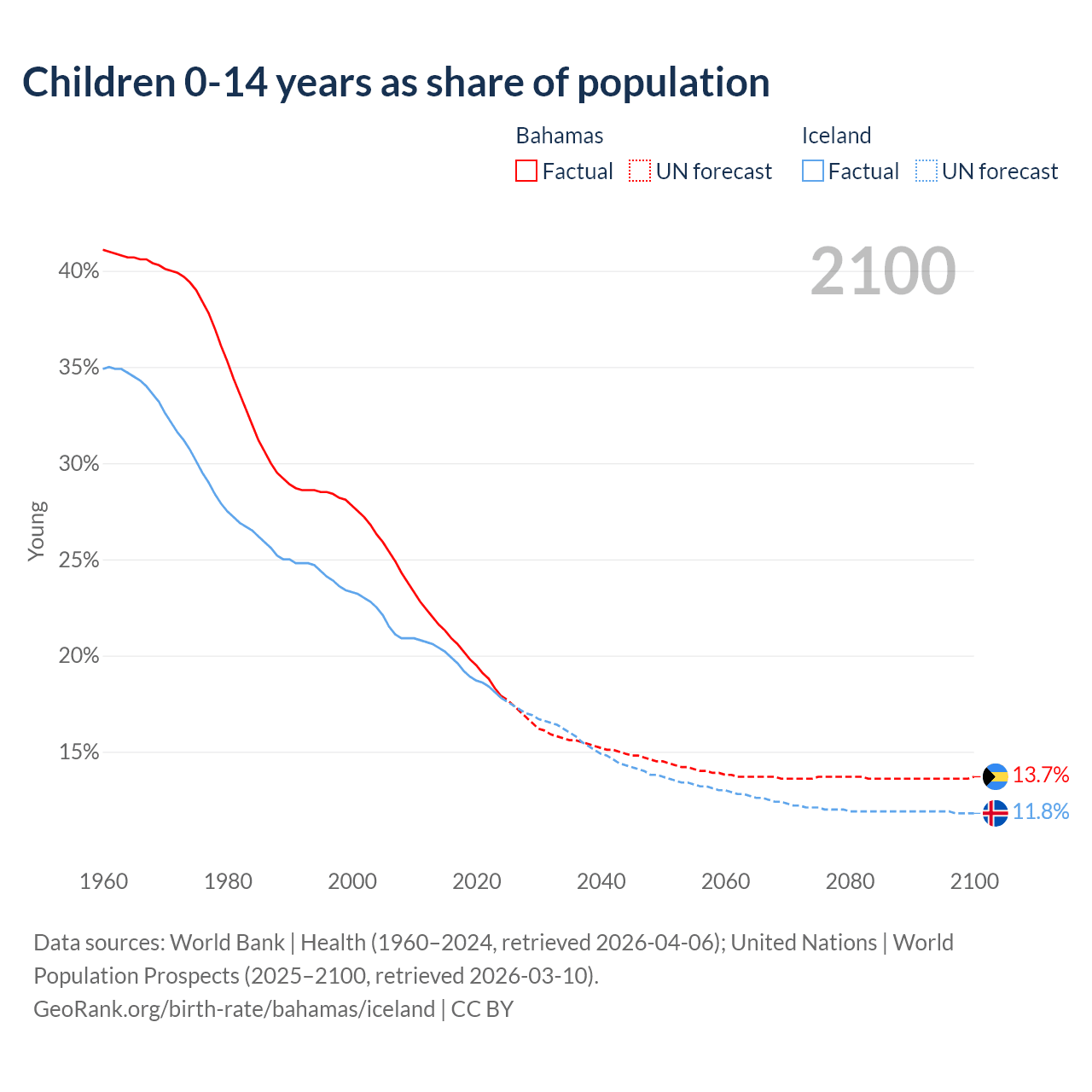 According to the latest available data on birth rates, the fertility rate in the Bahamas was 1.37 children per woman in 2023, compared to 1.59 in Iceland in 2023. The replacement level is considered to be 2.1 children per woman.