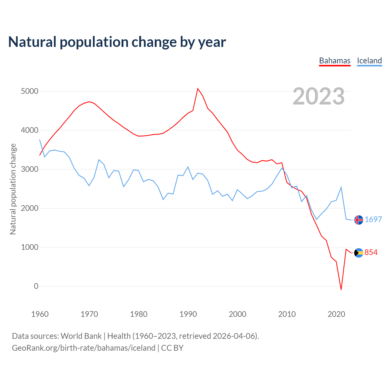 The Bahamas has an annual birth rate of 10.9 births per 1,000 people, compared to 11 for Iceland. The average number of children a woman is expected to have during her lifetime — the fertility rate, is 1.37 in the Bahamas and 1.59 in Iceland — 15.8% difference.