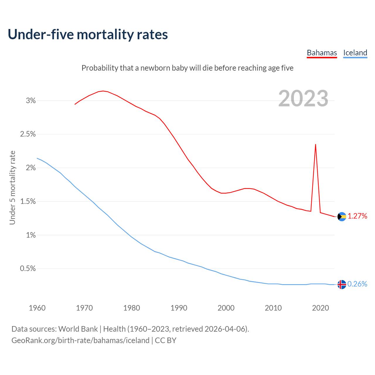 The chance that a newborn baby will die before reaching age five is 1.27% in the Bahamas and 0.26% in Iceland. Above is a chart with historical data on under-five mortality rates.