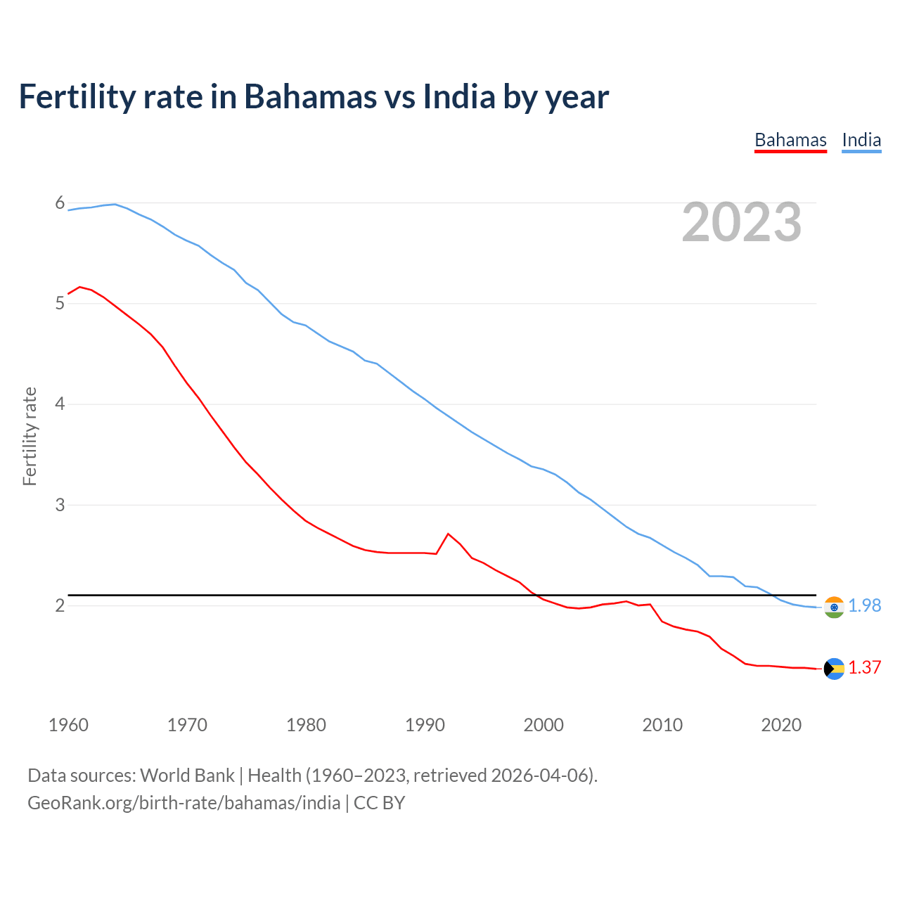 1960 vs 2023, the fertility rate has decreased by 73% in the Bahamas and by 66.6% in India — in 1960, it was 5.09 and 5.92, respectively.