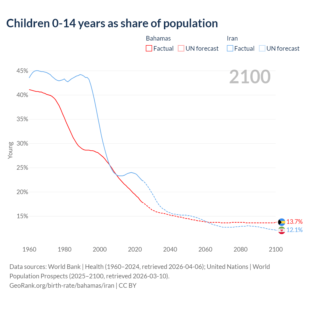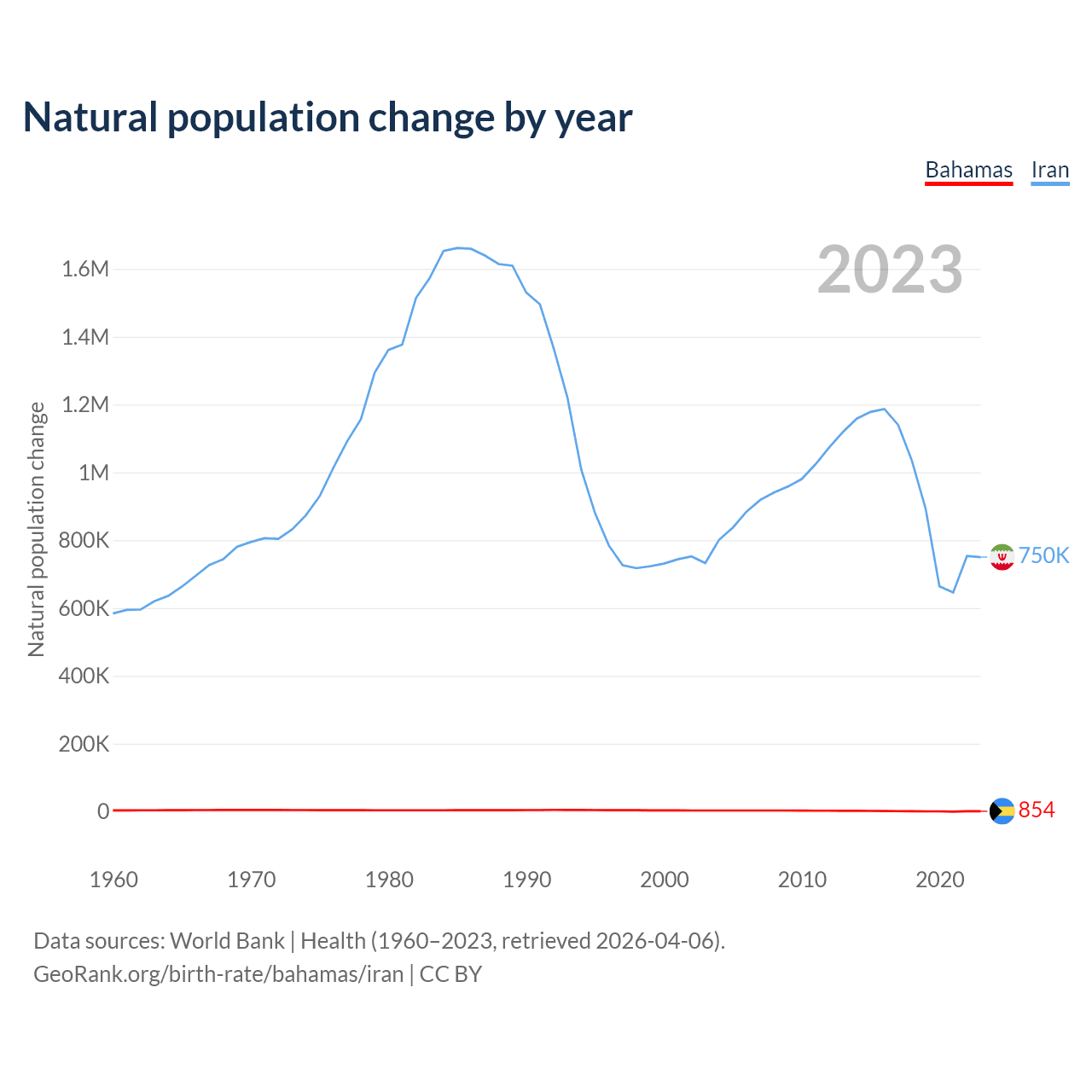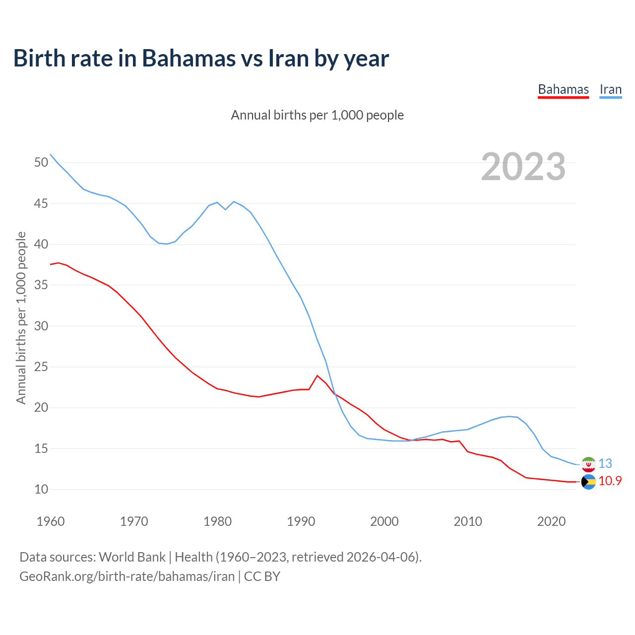 The Bahamas has an annual birth rate of 10.9 births per 1,000 people, compared to 13 for Iran. The average number of children a woman is expected to have during her lifetime — the fertility rate, is 1.37 in the Bahamas and 1.7 in Iran — 23.5% difference.