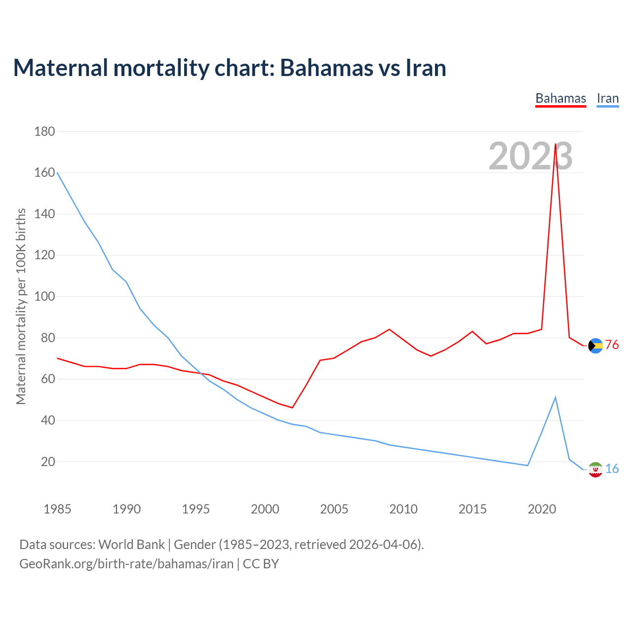 The maternal mortality rate, which is the probability of dying during childbirth or within 42 days of pregnancy termination, is 76 deaths per 100,000 live births in the Bahamas, compared to 16 deaths in Iran.