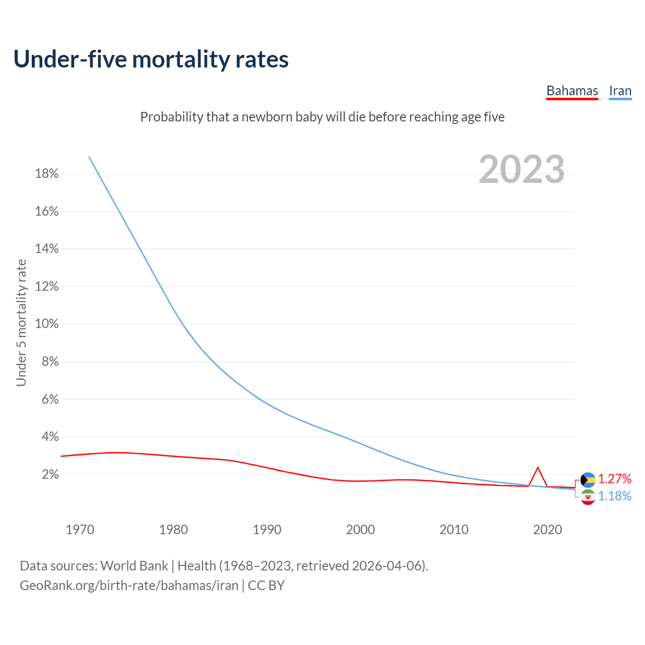 The chance that a newborn baby will die before reaching age five is 1.27% in the Bahamas and 1.18% in Iran. Above is a chart with historical data on under-five mortality rates.