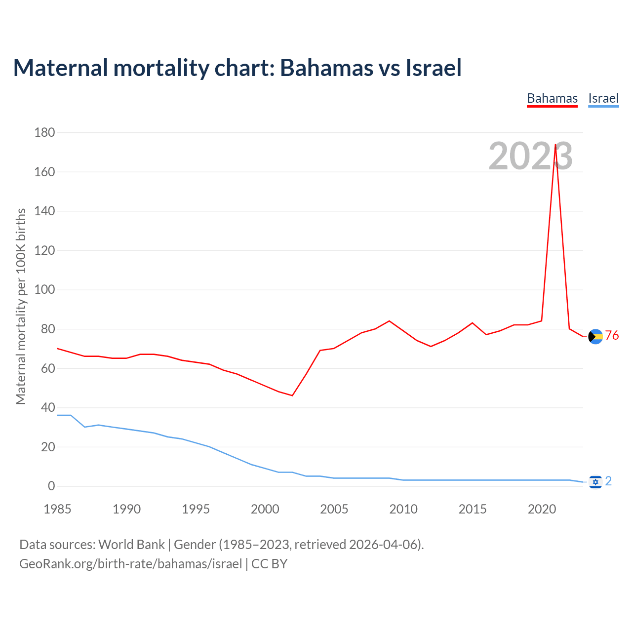 The maternal mortality rate, which is the probability of dying during childbirth or within 42 days of pregnancy termination, is 76 deaths per 100,000 live births in the Bahamas, compared to 2 deaths in Israel.