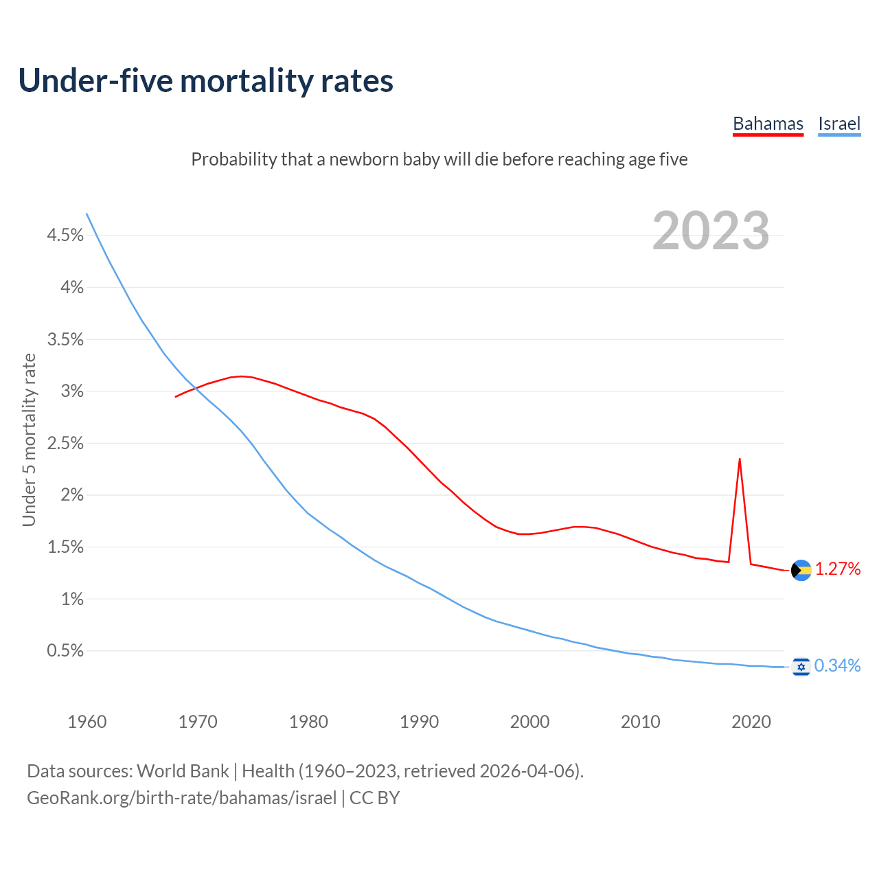 The chance that a newborn baby will die before reaching age five is 1.27% in the Bahamas and 0.34% in Israel. Above is a chart with historical data on under-five mortality rates.