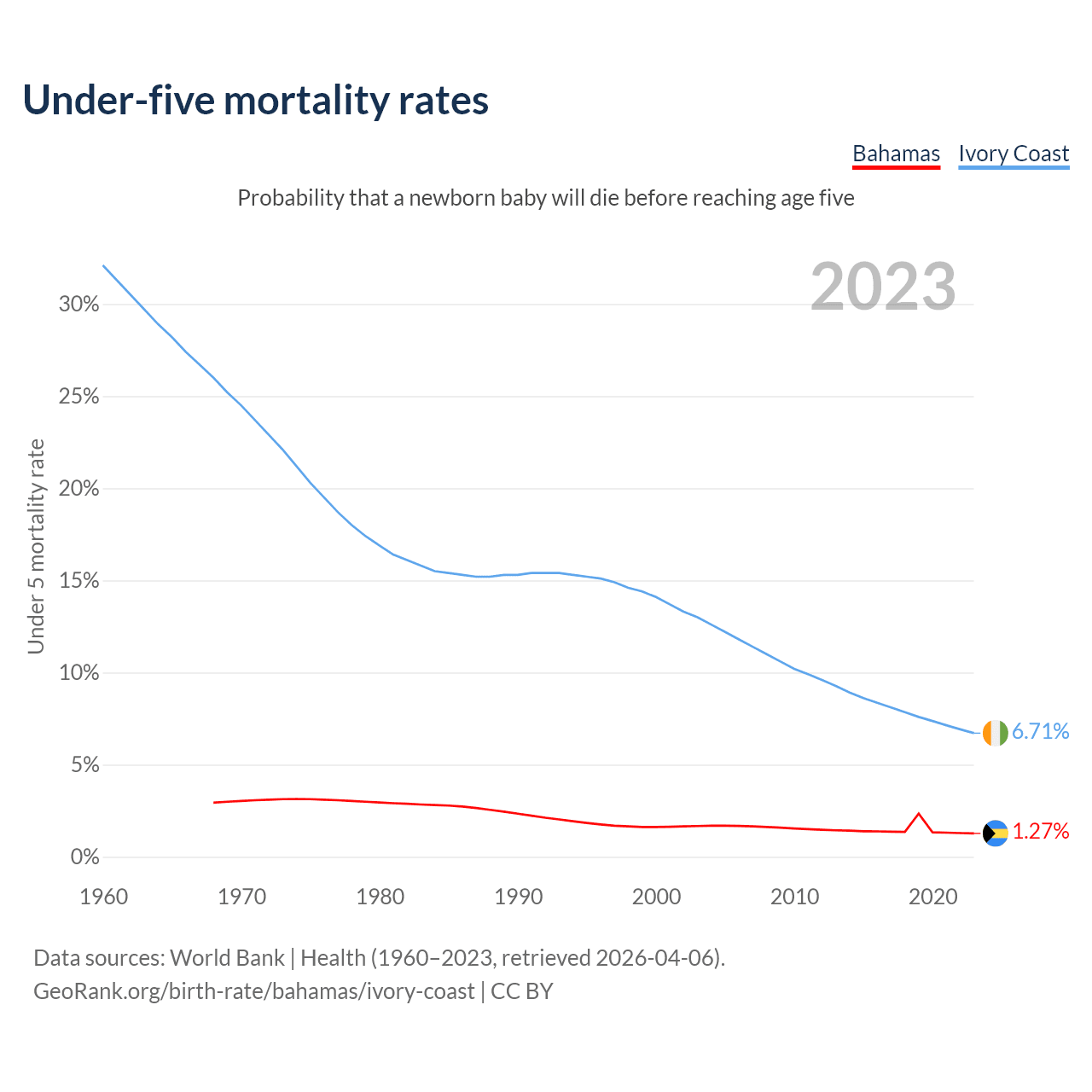 The chance that a newborn baby will die before reaching age five is 1.27% in the Bahamas and 6.71% in Ivory Coast. Above is a chart with historical data on under-five mortality rates.