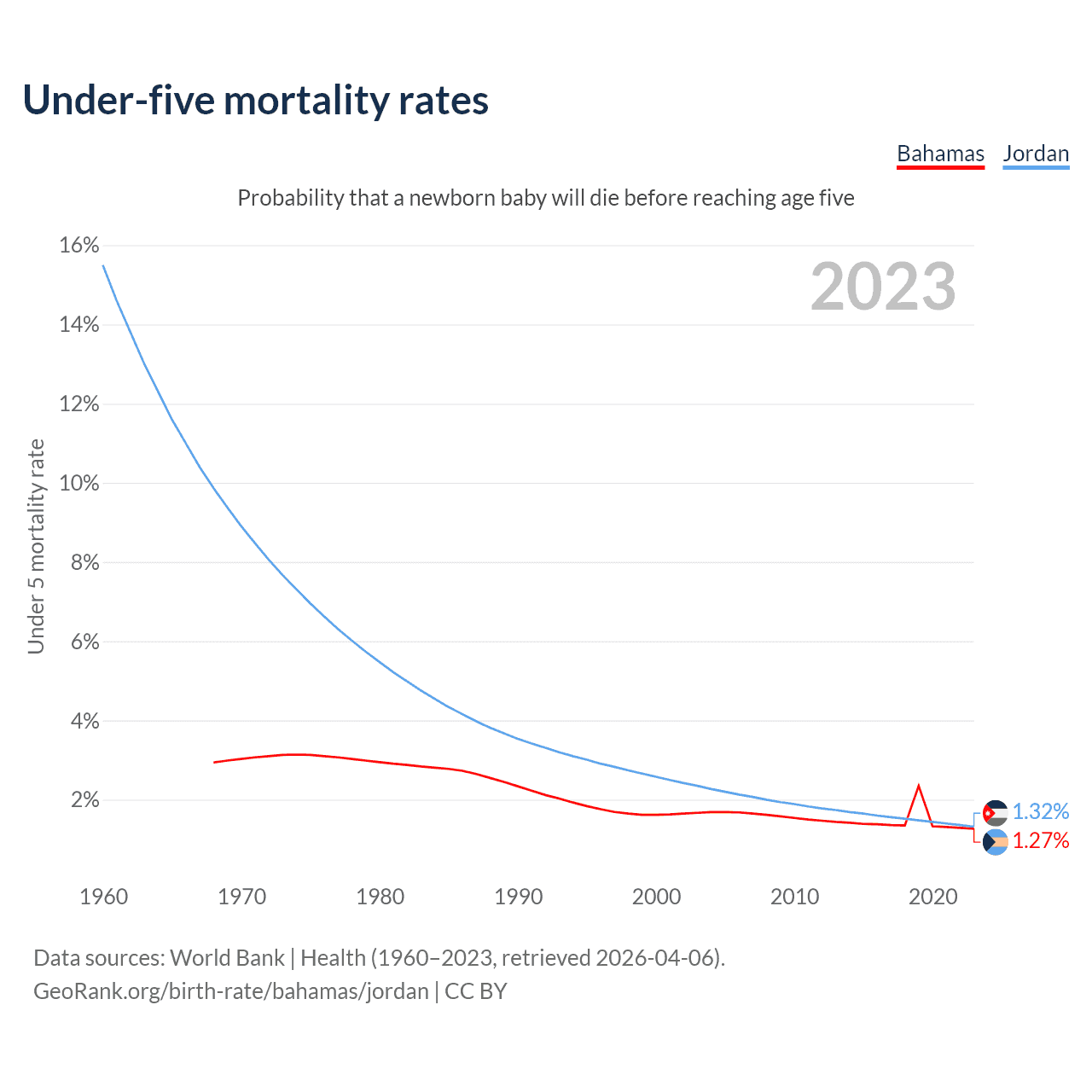 The chance that a newborn baby will die before reaching age five is 1.27% in the Bahamas and 1.32% in Jordan. Above is a chart with historical data on under-five mortality rates.