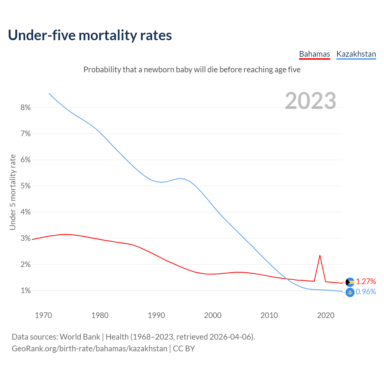 The chance that a newborn baby will die before reaching age five is 1.27% in the Bahamas and 0.96% in Kazakhstan. Above is a chart with historical data on under-five mortality rates.