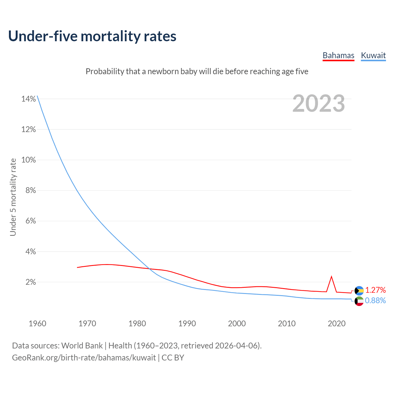 The chance that a newborn baby will die before reaching age five is 1.27% in the Bahamas and 0.88% in Kuwait. Above is a chart with historical data on under-five mortality rates.