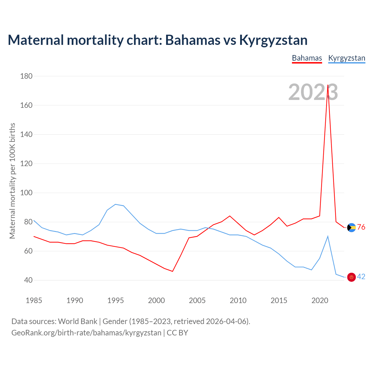 The maternal mortality rate, which is the probability of dying during childbirth or within 42 days of pregnancy termination, is 76 deaths per 100,000 live births in the Bahamas, compared to 42 deaths in Kyrgyzstan.