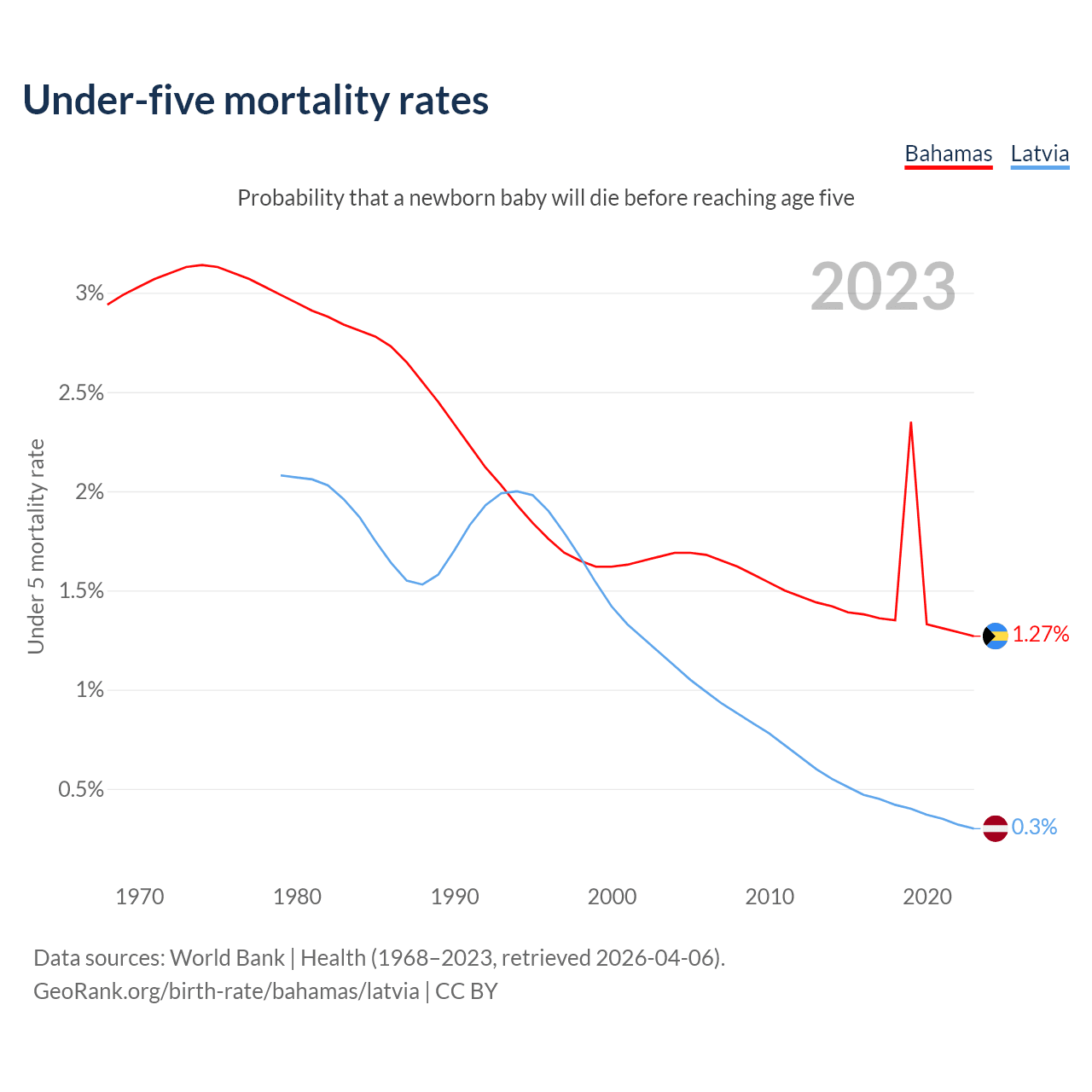 The chance that a newborn baby will die before reaching age five is 1.27% in the Bahamas and 0.3% in Latvia. Above is a chart with historical data on under-five mortality rates.