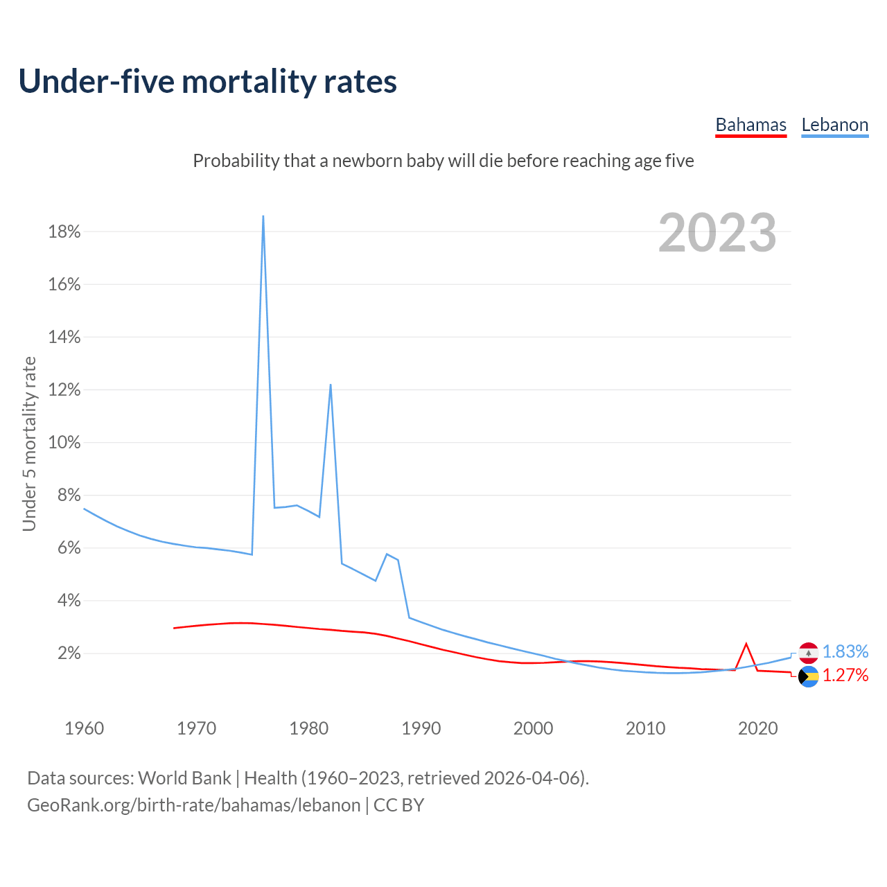 The chance that a newborn baby will die before reaching age five is 1.27% in the Bahamas and 1.83% in Lebanon. Above is a chart with historical data on under-five mortality rates.