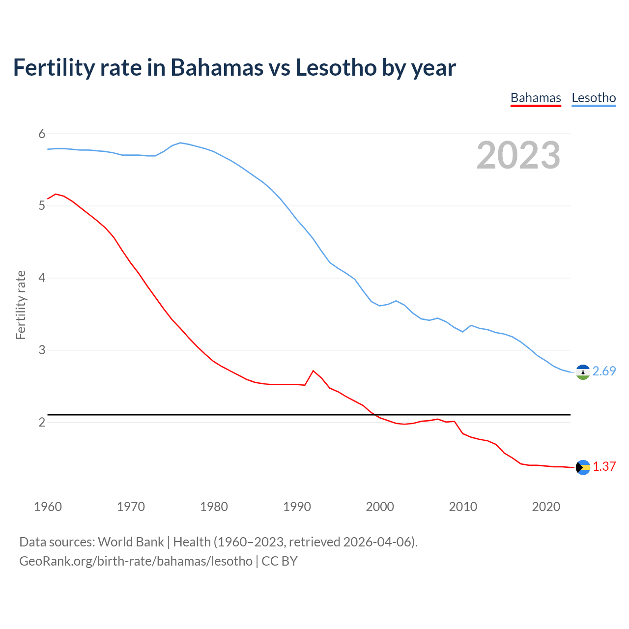1960 vs 2023, the fertility rate has decreased by 73% in the Bahamas and by 53.4% in Lesotho — in 1960, it was 5.09 and 5.78, respectively.