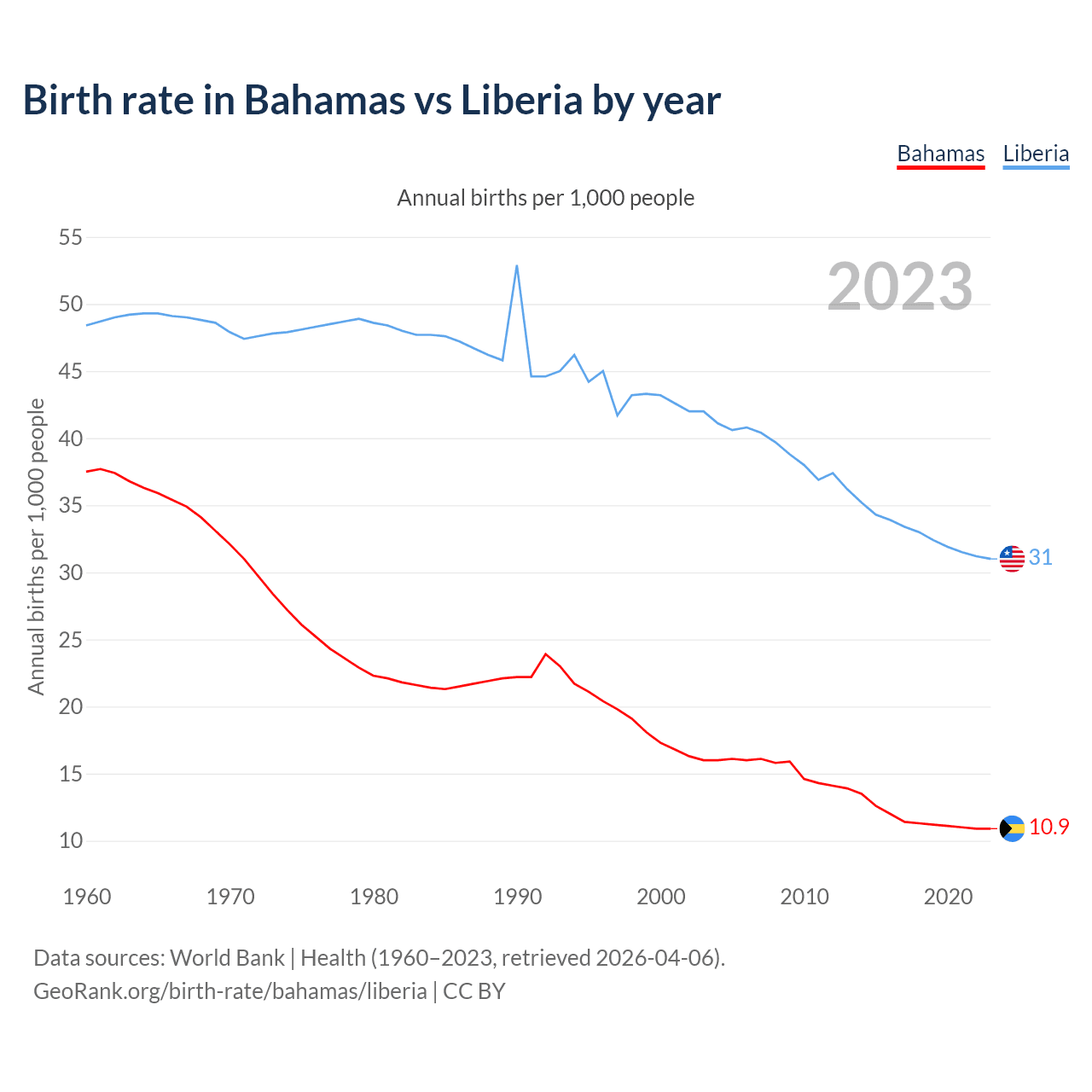 The Bahamas has an annual birth rate of 10.9 births per 1,000 people, compared to 31 for Liberia. The average number of children a woman is expected to have during her lifetime — the fertility rate, is 1.37 in the Bahamas and 3.95 in Liberia — 187.7% difference.