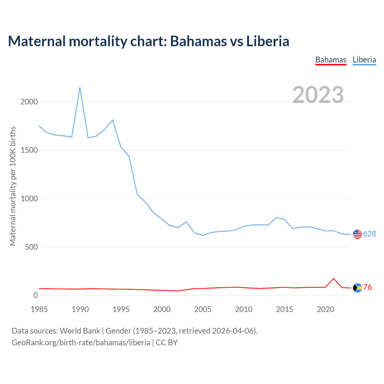 The maternal mortality rate, which is the probability of dying during childbirth or within 42 days of pregnancy termination, is 76 deaths per 100,000 live births in the Bahamas, compared to 628 deaths in Liberia.