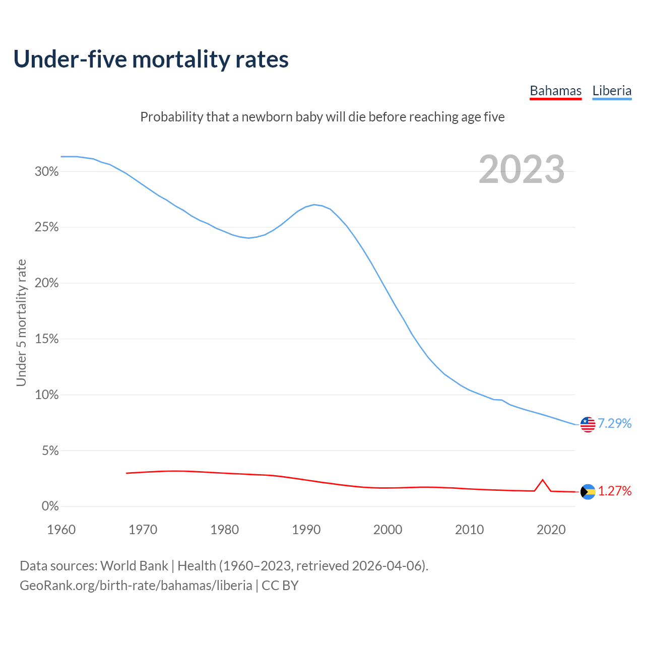 The chance that a newborn baby will die before reaching age five is 1.27% in the Bahamas and 7.29% in Liberia. Above is a chart with historical data on under-five mortality rates.