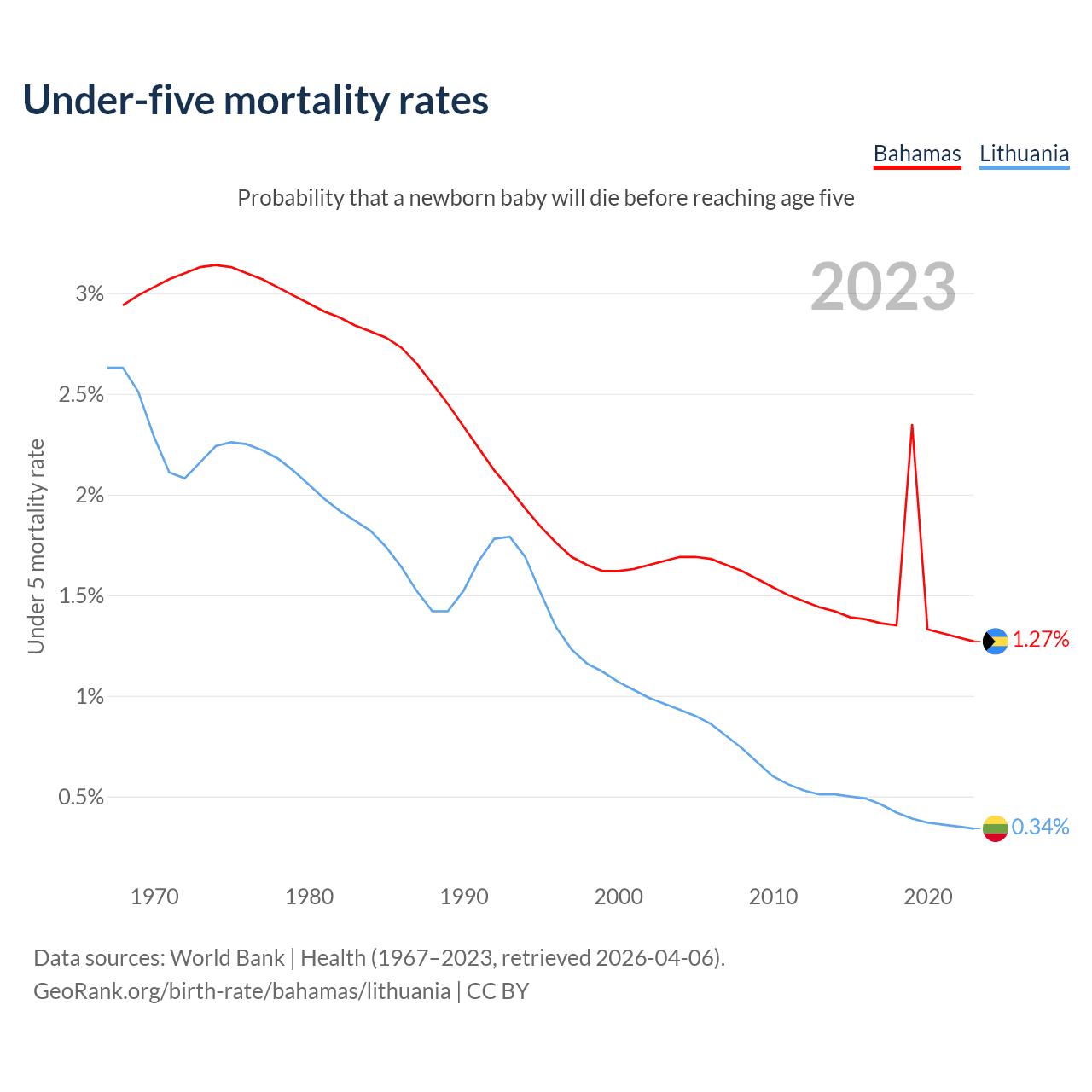 The chance that a newborn baby will die before reaching age five is 1.27% in the Bahamas and 0.34% in Lithuania. Above is a chart with historical data on under-five mortality rates.