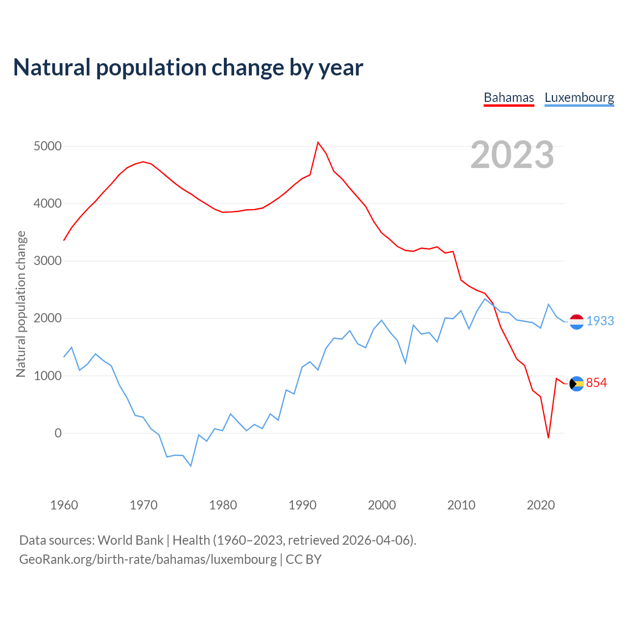 According to the latest available data on birth rates, the fertility rate in the Bahamas was 1.37 children per woman in 2023, compared to 1.25 in Luxembourg in 2023. The replacement level is considered to be 2.1 children per woman.