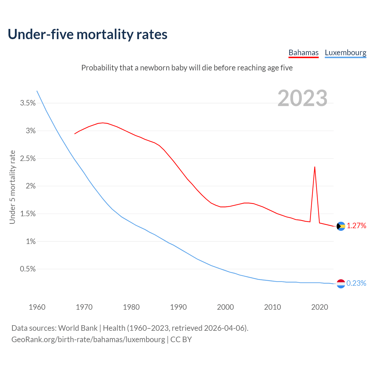 The chance that a newborn baby will die before reaching age five is 1.27% in the Bahamas and 0.23% in Luxembourg. Above is a chart with historical data on under-five mortality rates.