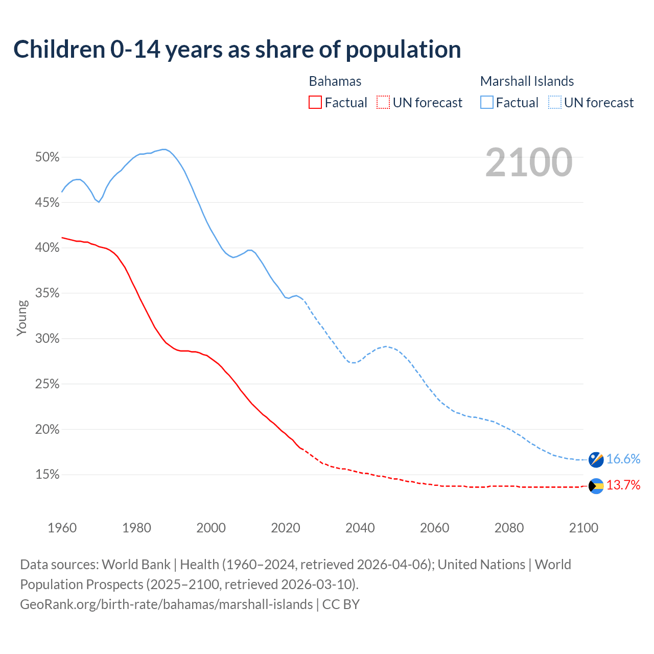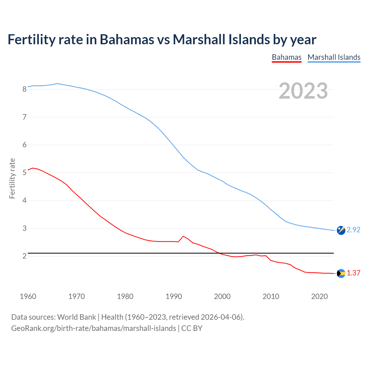 According to the latest available data on birth rates, the fertility rate in the Bahamas was 1.37 children per woman in 2023, compared to 2.92 in the Marshall Islands in 2023. The replacement level is considered to be 2.1 children per woman.