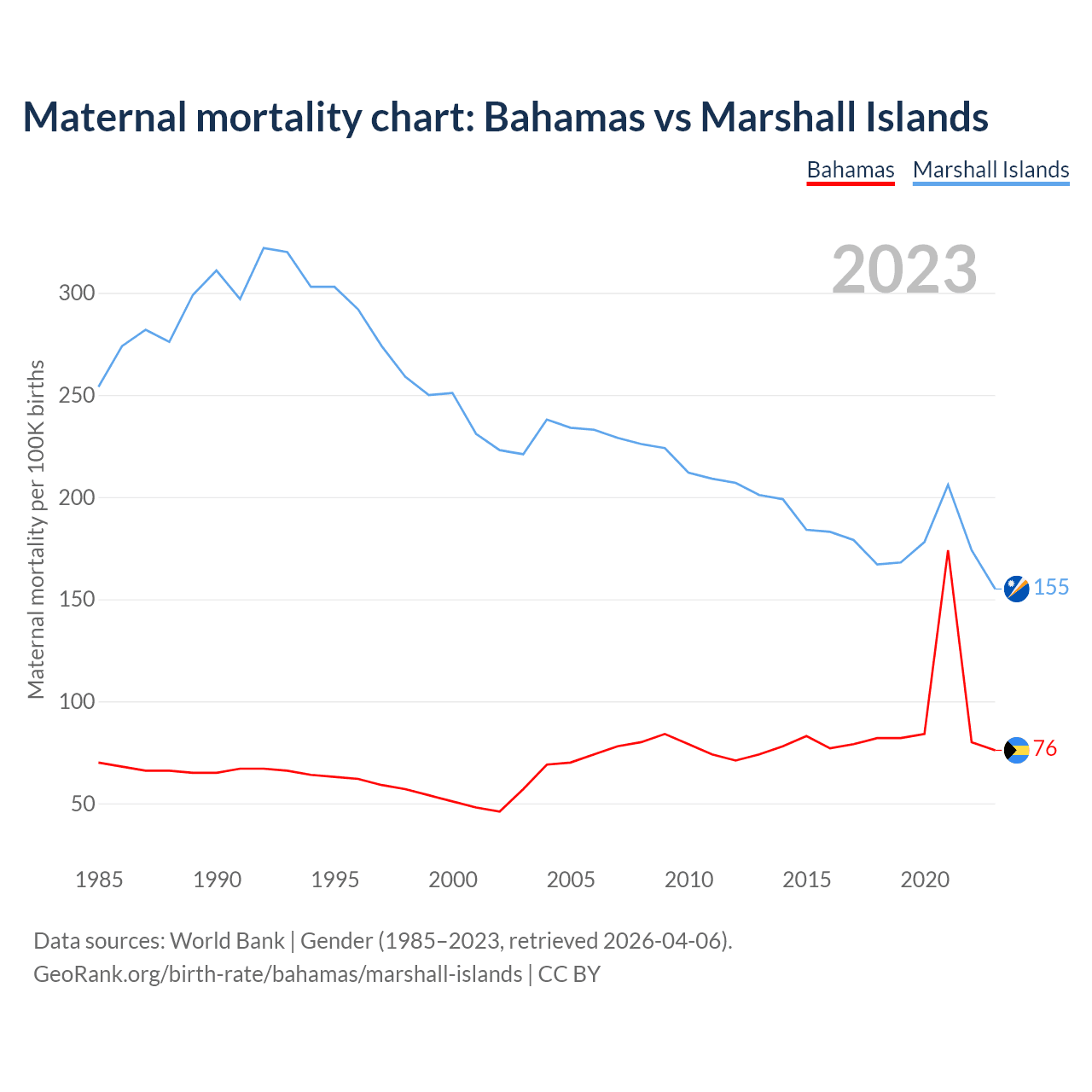 The maternal mortality rate, which is the probability of dying during childbirth or within 42 days of pregnancy termination, is 76 deaths per 100,000 live births in the Bahamas, compared to 155 deaths in the Marshall Islands.