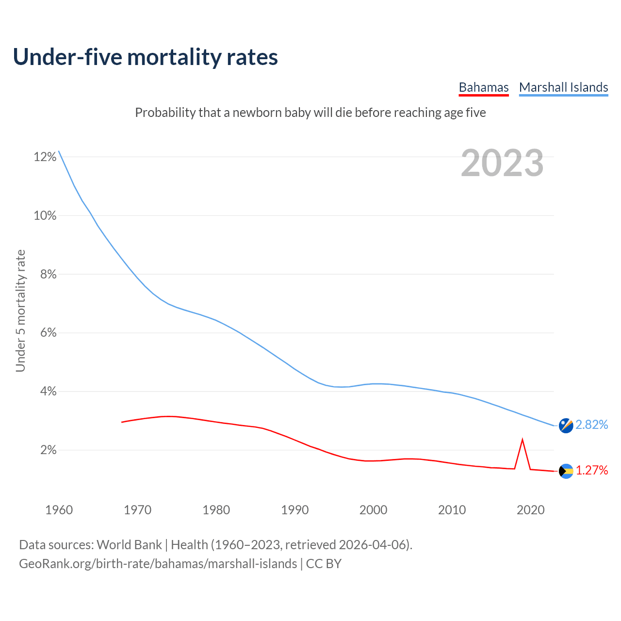 The chance that a newborn baby will die before reaching age five is 1.27% in the Bahamas and 2.82% in the Marshall Islands. Above is a chart with historical data on under-five mortality rates.
