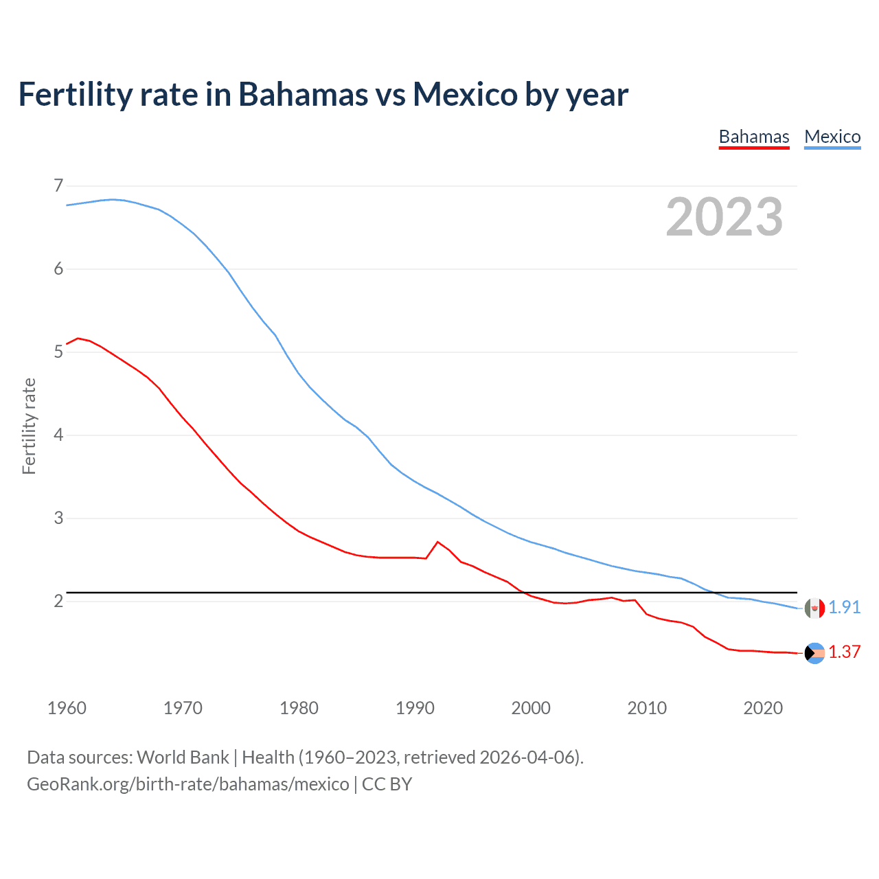 1960 vs 2023, the fertility rate has decreased by 73% in the Bahamas and by 71.8% in Mexico — in 1960, it was 5.09 and 6.76, respectively.