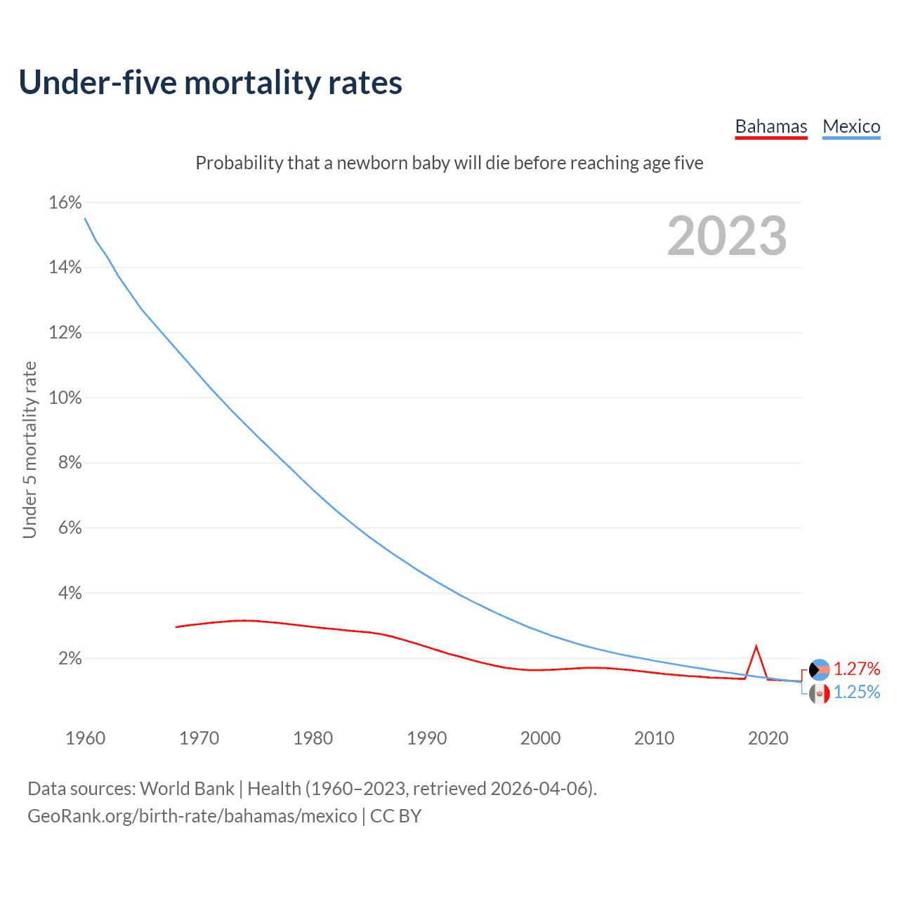 The chance that a newborn baby will die before reaching age five is 1.27% in the Bahamas and 1.25% in Mexico. Above is a chart with historical data on under-five mortality rates.