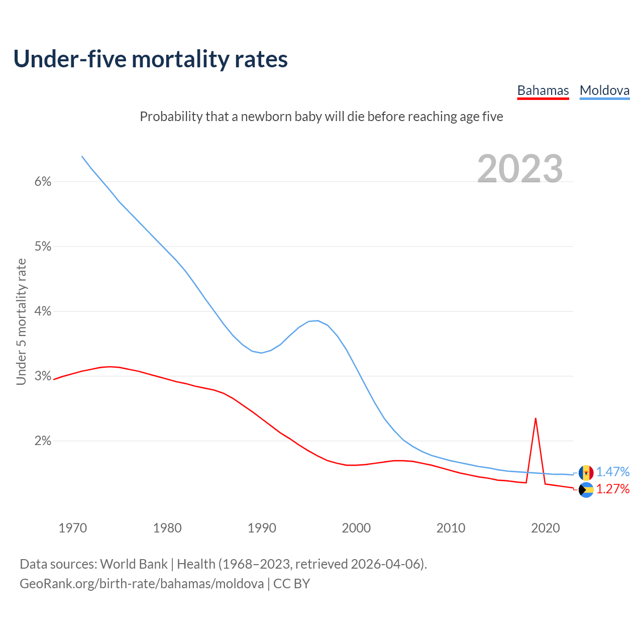 The chance that a newborn baby will die before reaching age five is 1.27% in the Bahamas and 1.47% in Moldova. Above is a chart with historical data on under-five mortality rates.