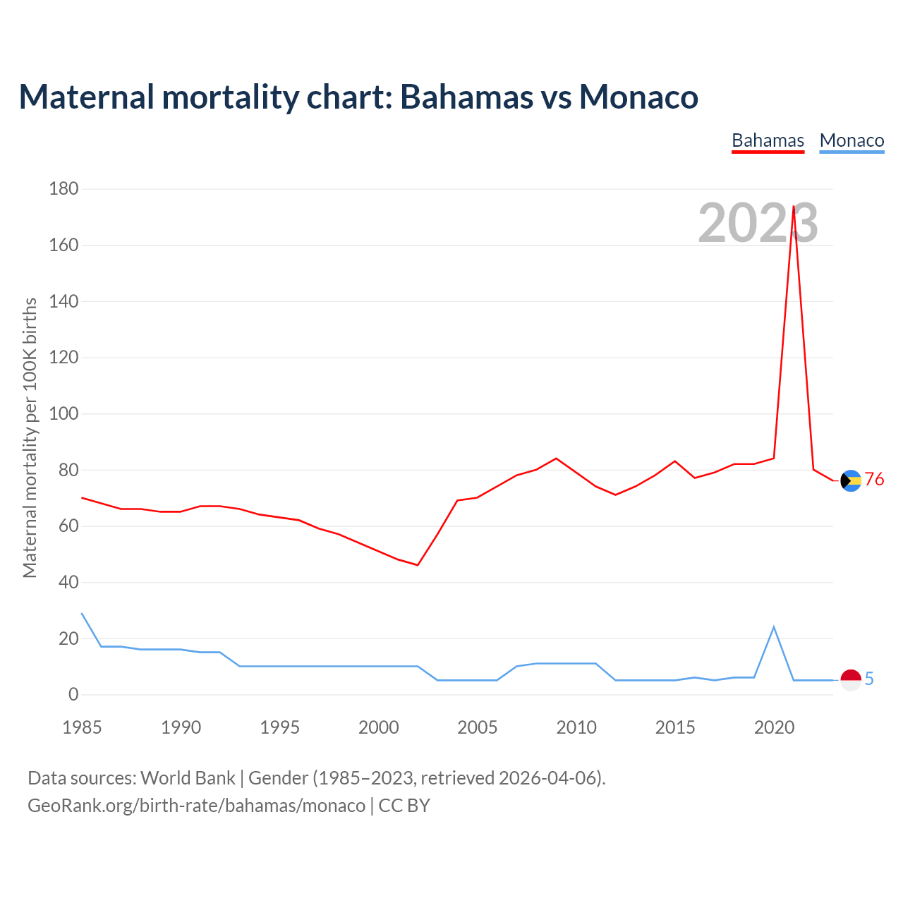 The maternal mortality rate, which is the probability of dying during childbirth or within 42 days of pregnancy termination, is 76 deaths per 100,000 live births in the Bahamas, compared to 5 deaths in Monaco.