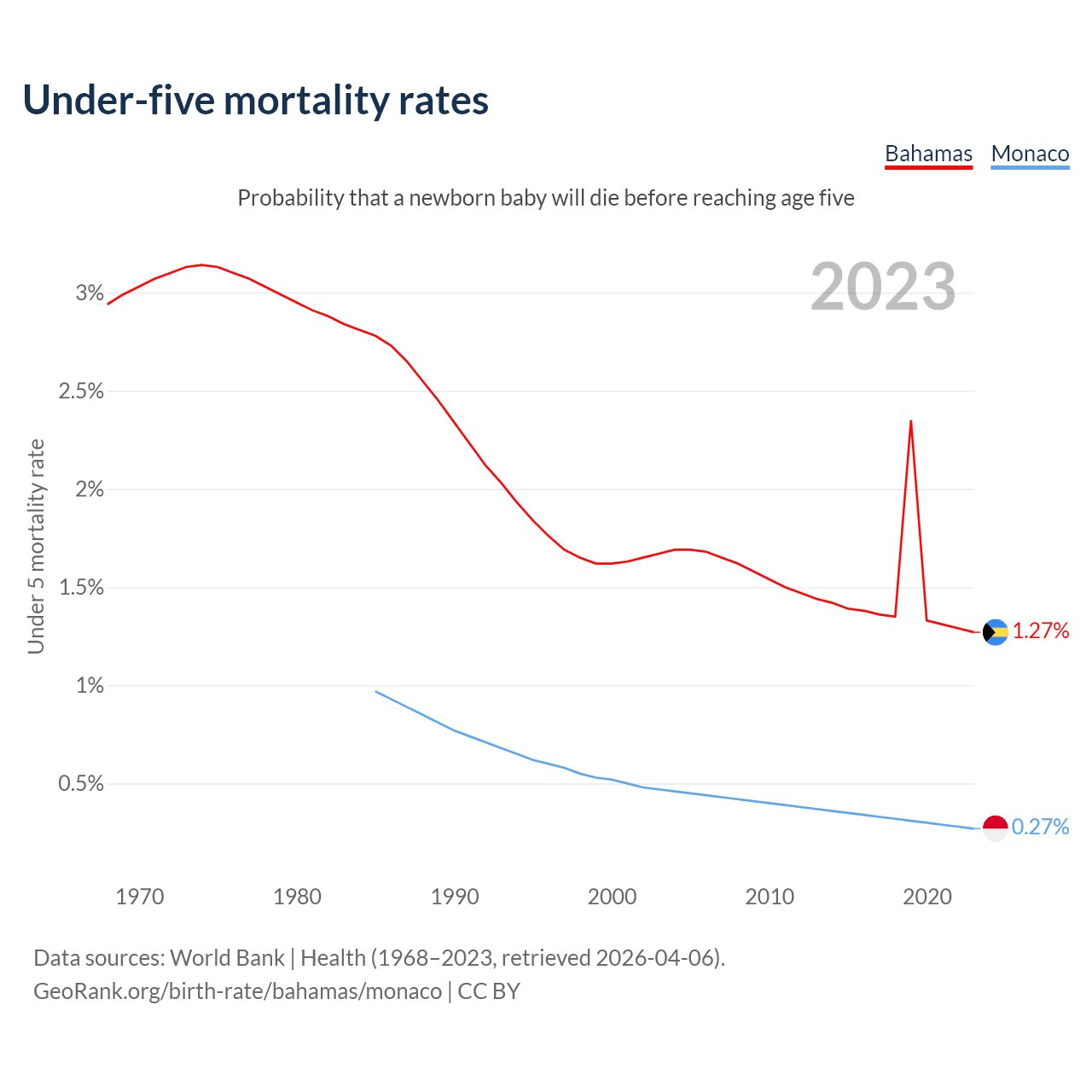 The chance that a newborn baby will die before reaching age five is 1.27% in the Bahamas and 0.27% in Monaco. Above is a chart with historical data on under-five mortality rates.