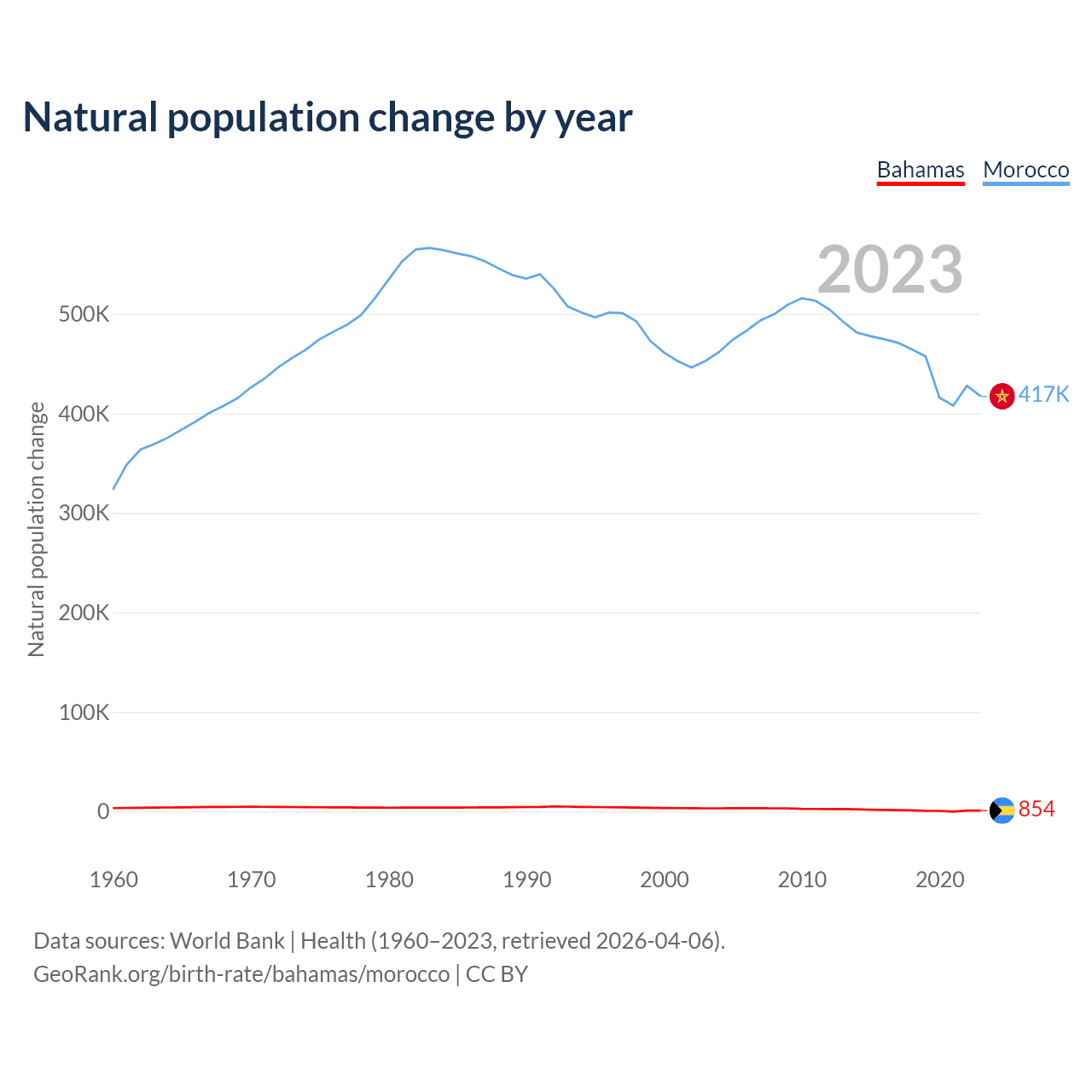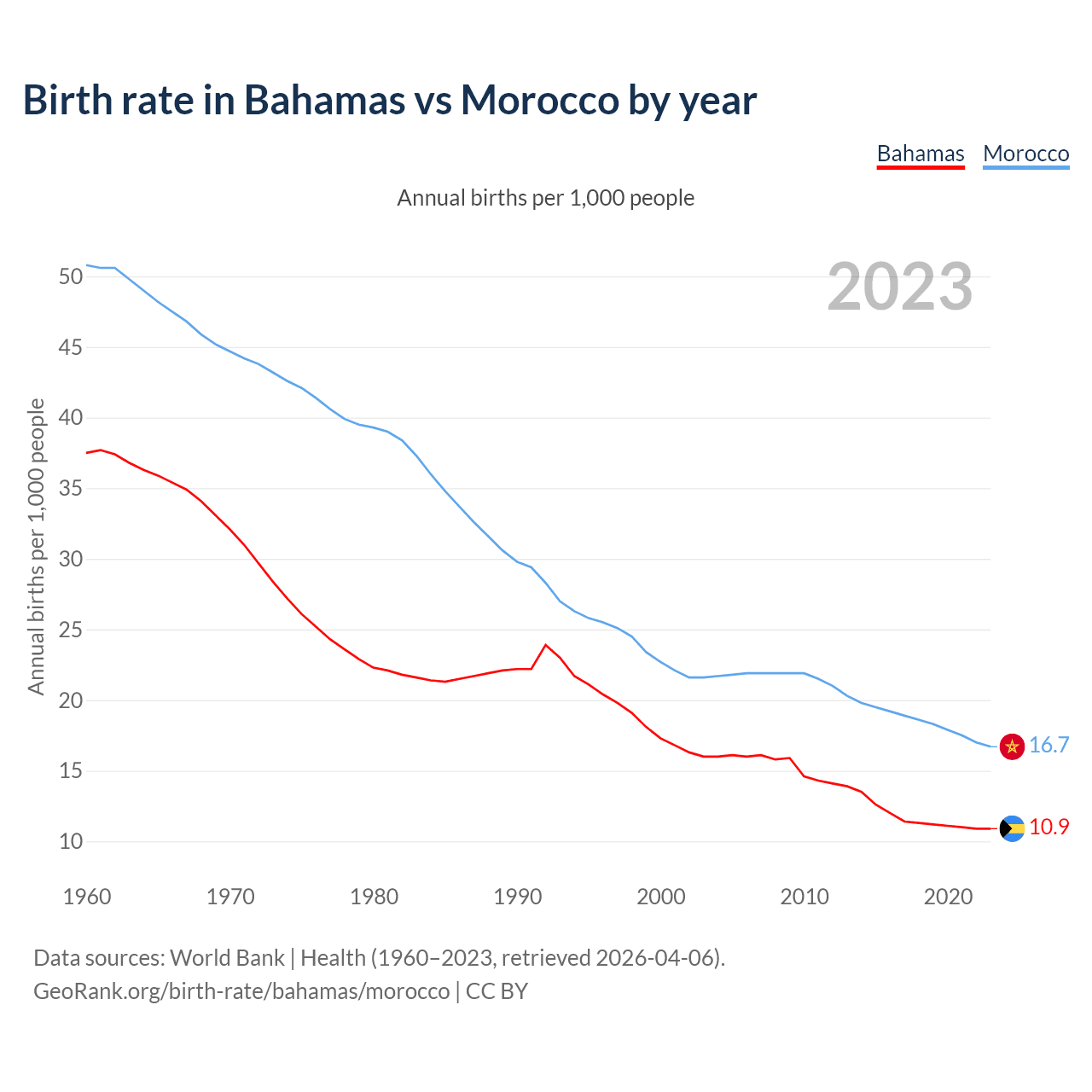 The Bahamas has an annual birth rate of 10.9 births per 1,000 people, compared to 16.7 for Morocco. The average number of children a woman is expected to have during her lifetime — the fertility rate, is 1.37 in the Bahamas and 2.23 in Morocco — 62.4% difference.
