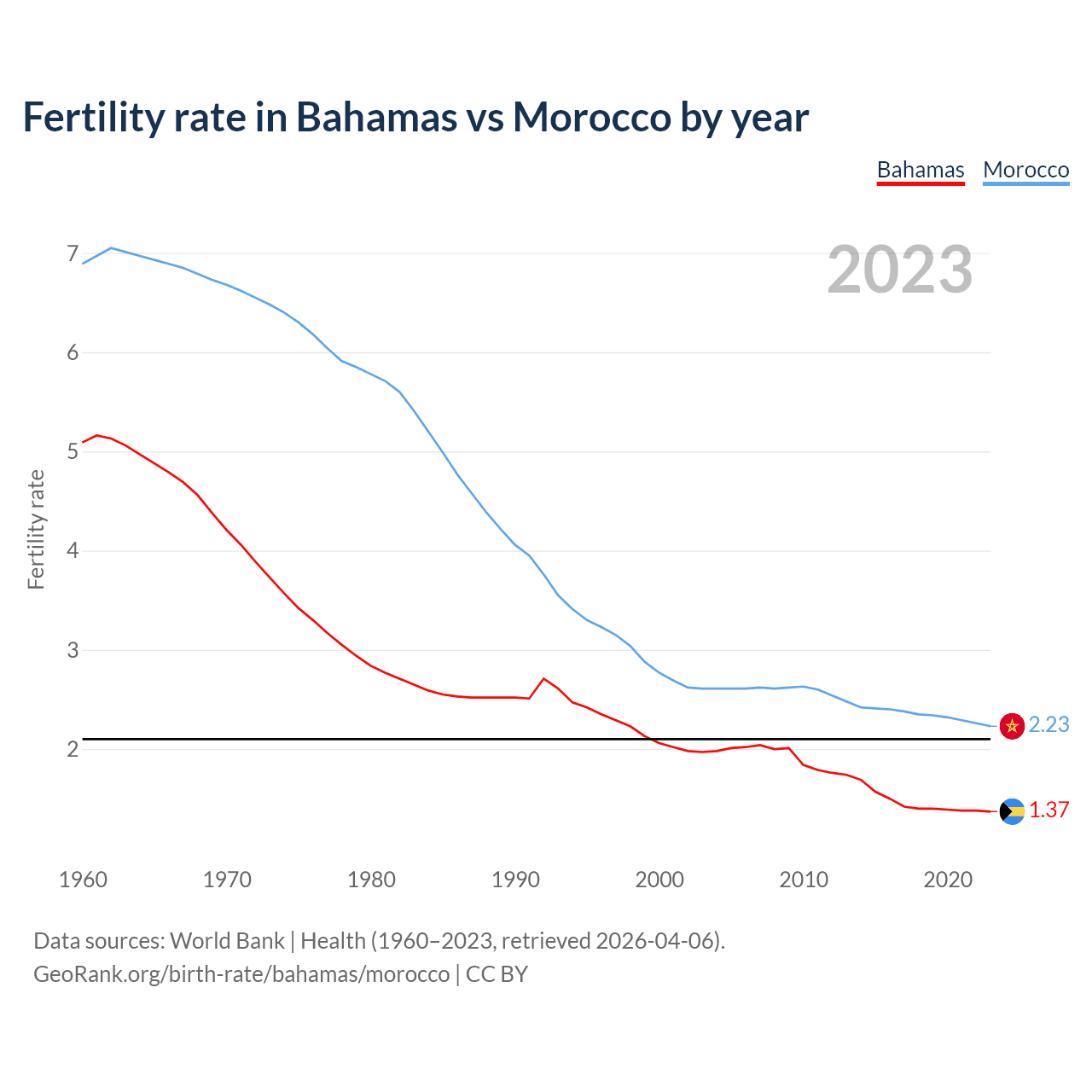 According to the latest available data on birth rates, the fertility rate in the Bahamas was 1.37 children per woman in 2023, compared to 2.23 in Morocco in 2023. The replacement level is considered to be 2.1 children per woman.