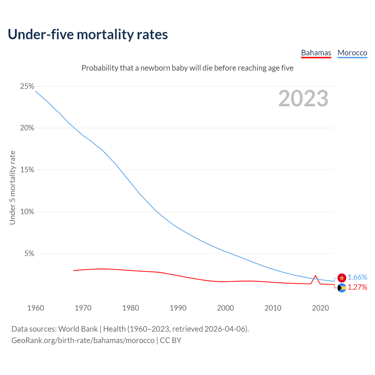 The chance that a newborn baby will die before reaching age five is 1.27% in the Bahamas and 1.66% in Morocco. Above is a chart with historical data on under-five mortality rates.