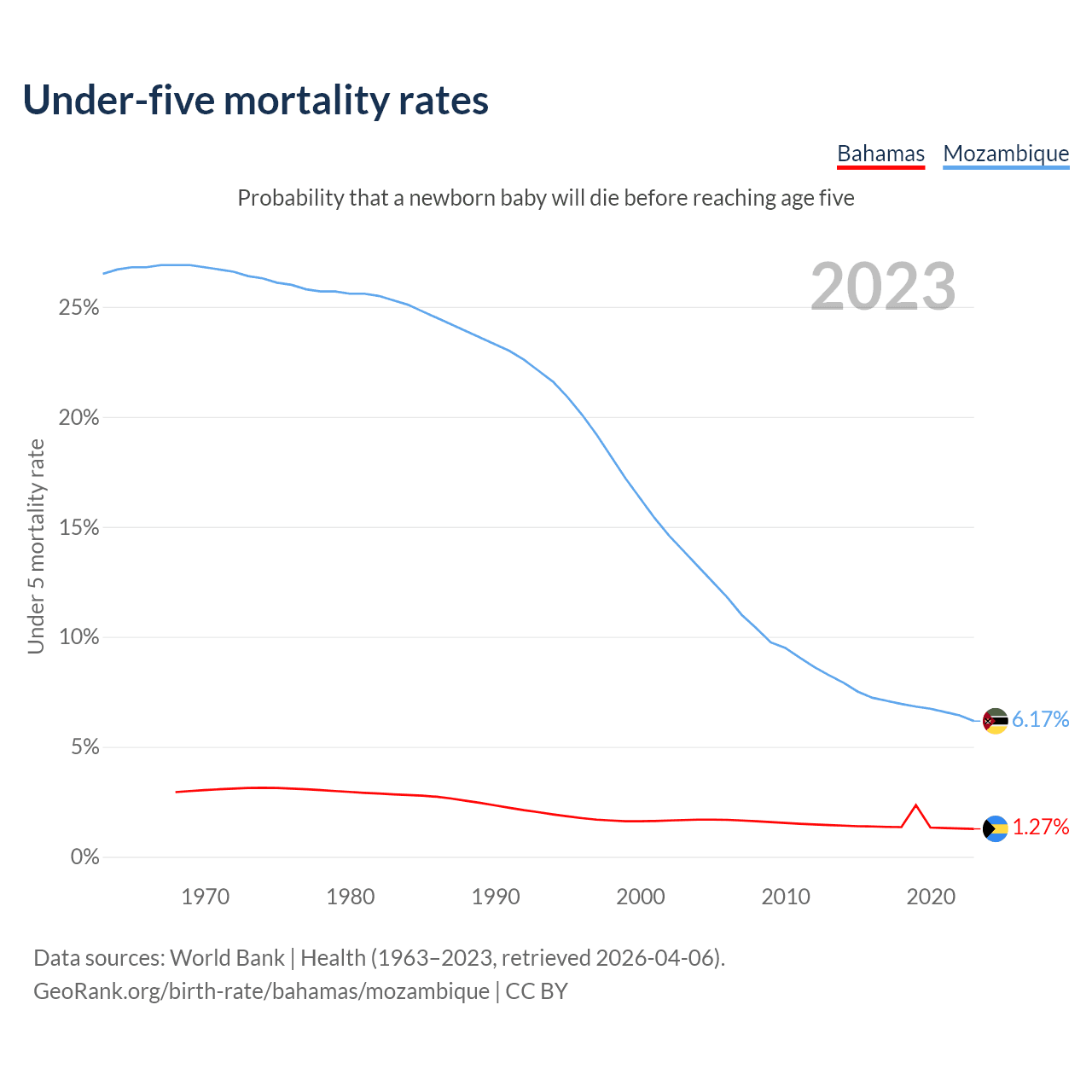 The chance that a newborn baby will die before reaching age five is 1.27% in the Bahamas and 6.17% in Mozambique. Above is a chart with historical data on under-five mortality rates.