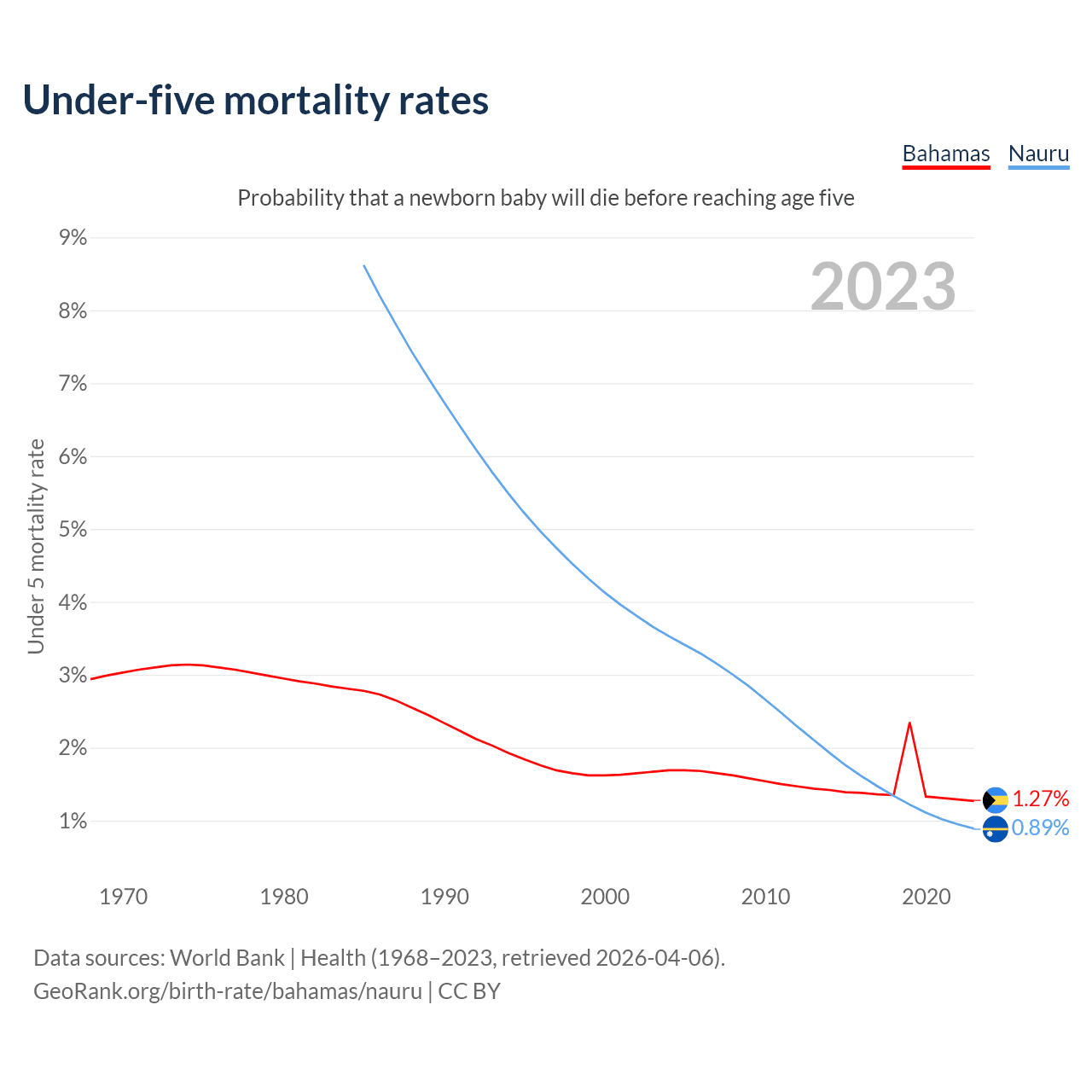 The chance that a newborn baby will die before reaching age five is 1.27% in the Bahamas and 0.89% in Nauru. Above is a chart with historical data on under-five mortality rates.