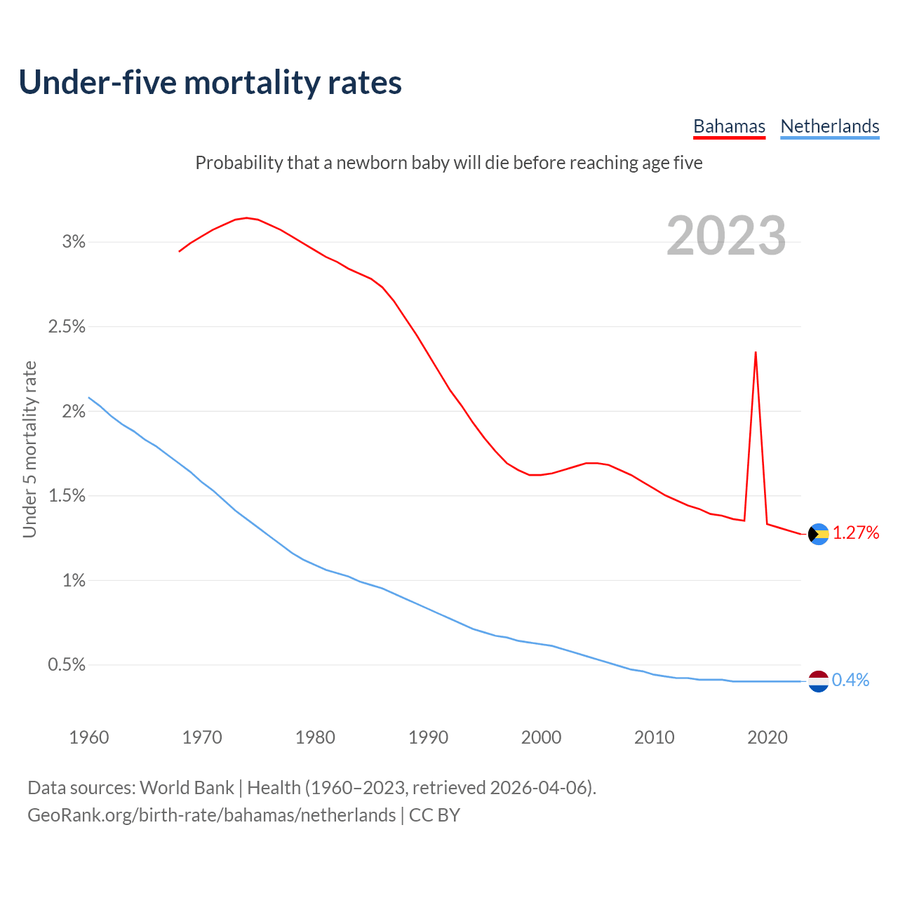 The chance that a newborn baby will die before reaching age five is 1.27% in the Bahamas and 0.4% in the Netherlands. Above is a chart with historical data on under-five mortality rates.