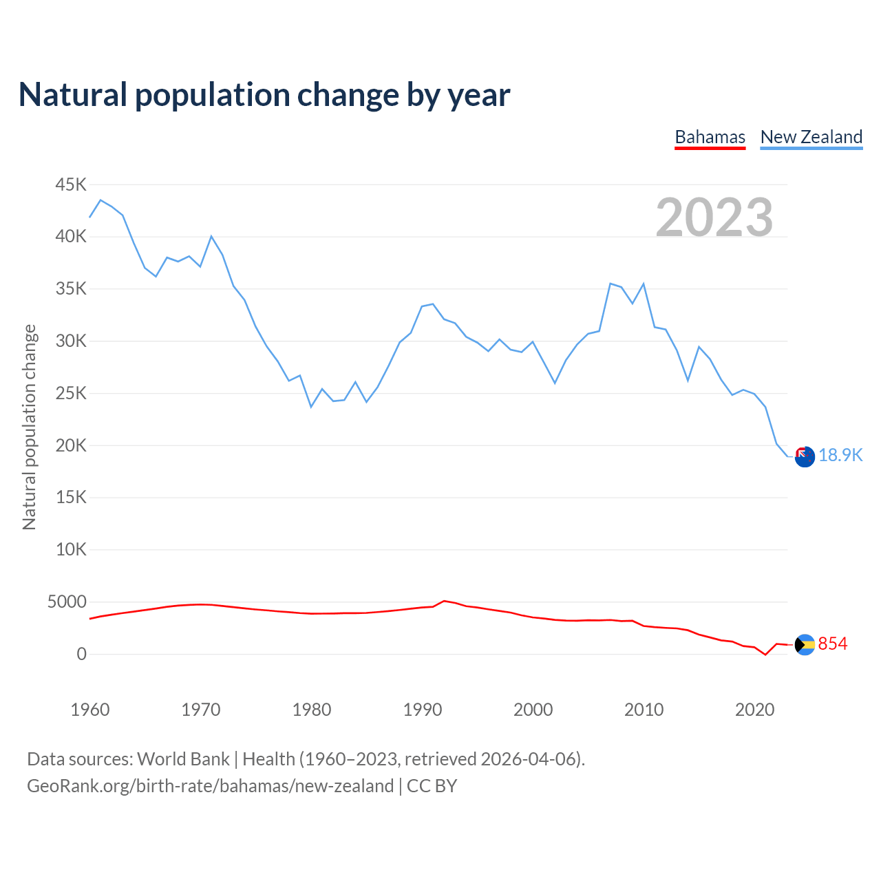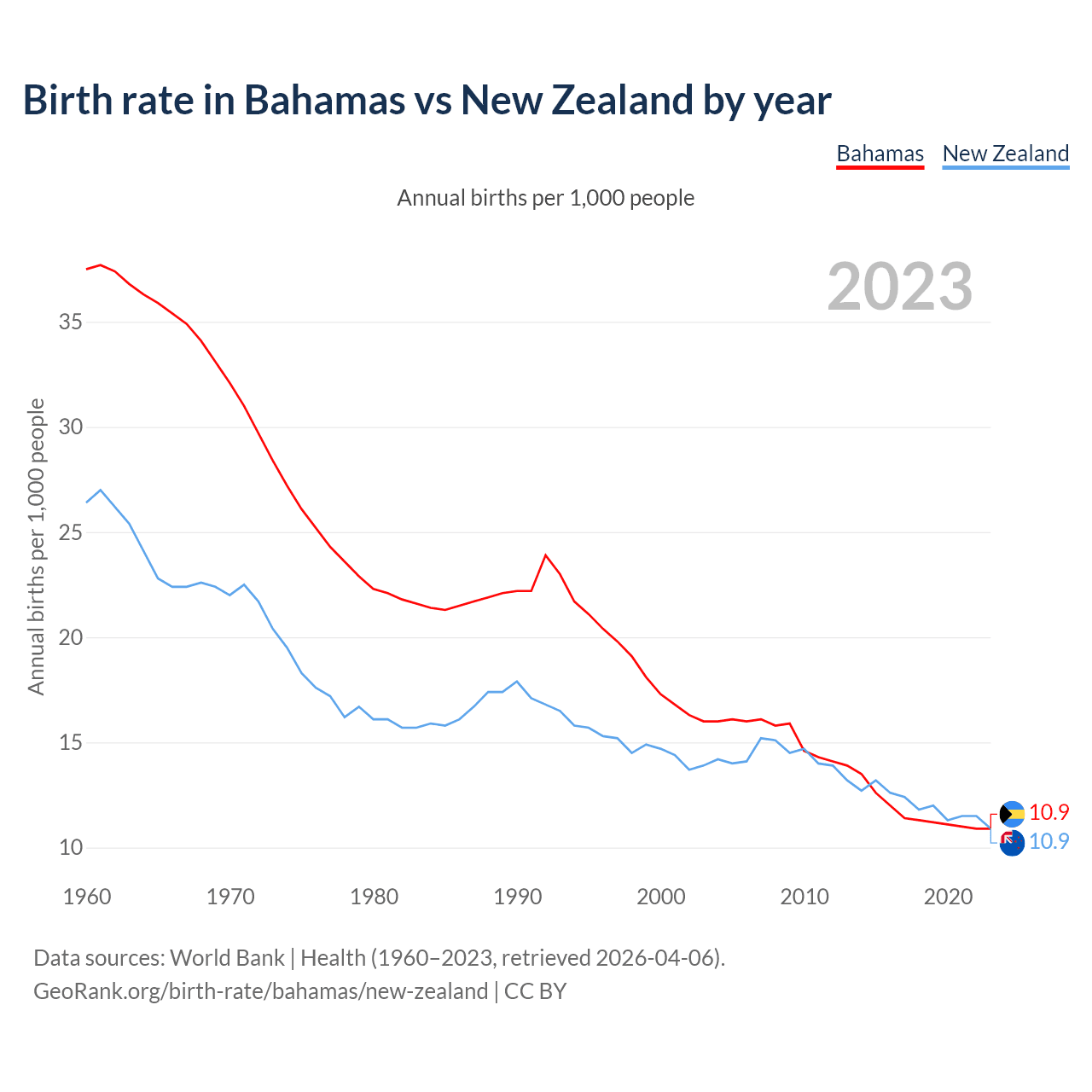 The Bahamas has an annual birth rate of 10.9 births per 1,000 people, compared to 10.9 for New Zealand. The average number of children a woman is expected to have during her lifetime — the fertility rate, is 1.37 in the Bahamas and 1.56 in New Zealand — 13.6% difference.