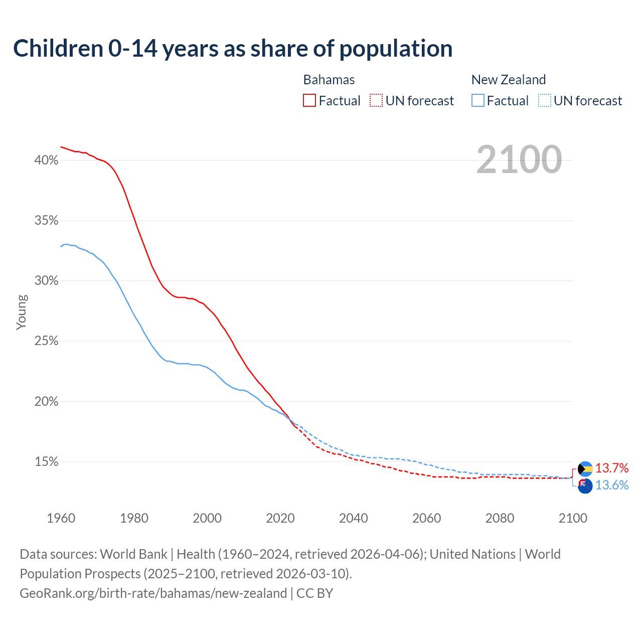 According to the latest available data on birth rates, the fertility rate in the Bahamas was 1.37 children per woman in 2023, compared to 1.56 in New Zealand in 2023. The replacement level is considered to be 2.1 children per woman.
