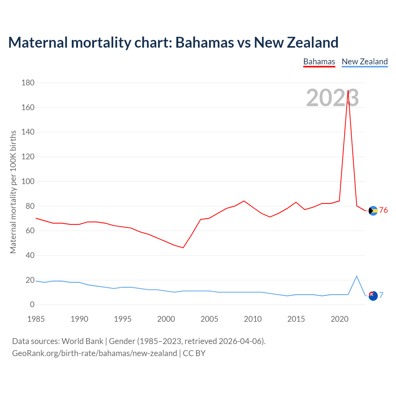 The maternal mortality rate, which is the probability of dying during childbirth or within 42 days of pregnancy termination, is 76 deaths per 100,000 live births in the Bahamas, compared to 7 deaths in New Zealand.