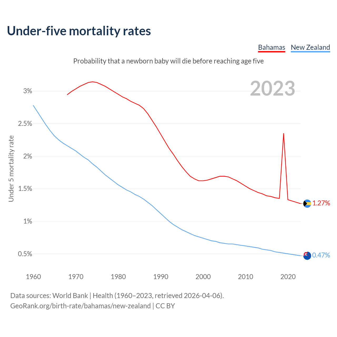 The chance that a newborn baby will die before reaching age five is 1.27% in the Bahamas and 0.47% in New Zealand. Above is a chart with historical data on under-five mortality rates.