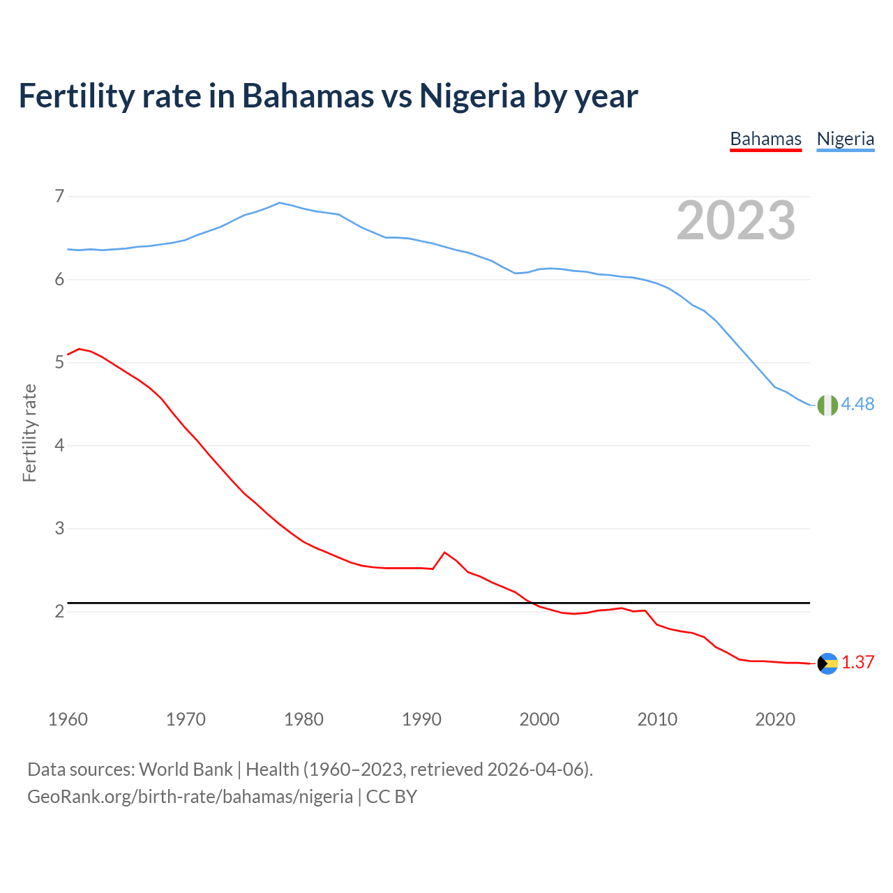 1960 vs 2023, the fertility rate has decreased by 73% in the Bahamas and by 29.6% in Nigeria — in 1960, it was 5.09 and 6.36, respectively.