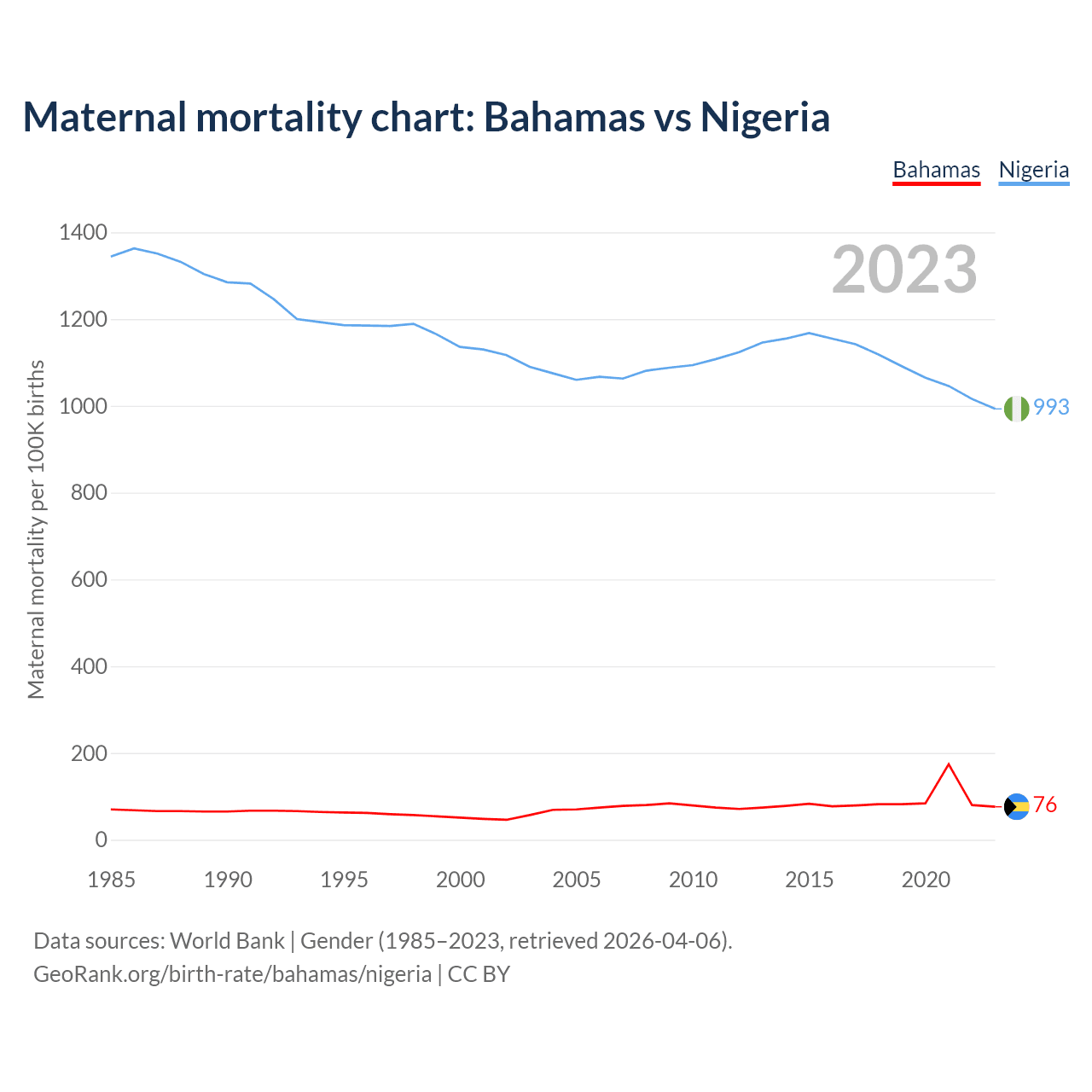 The maternal mortality rate, which is the probability of dying during childbirth or within 42 days of pregnancy termination, is 76 deaths per 100,000 live births in the Bahamas, compared to 993 deaths in Nigeria.