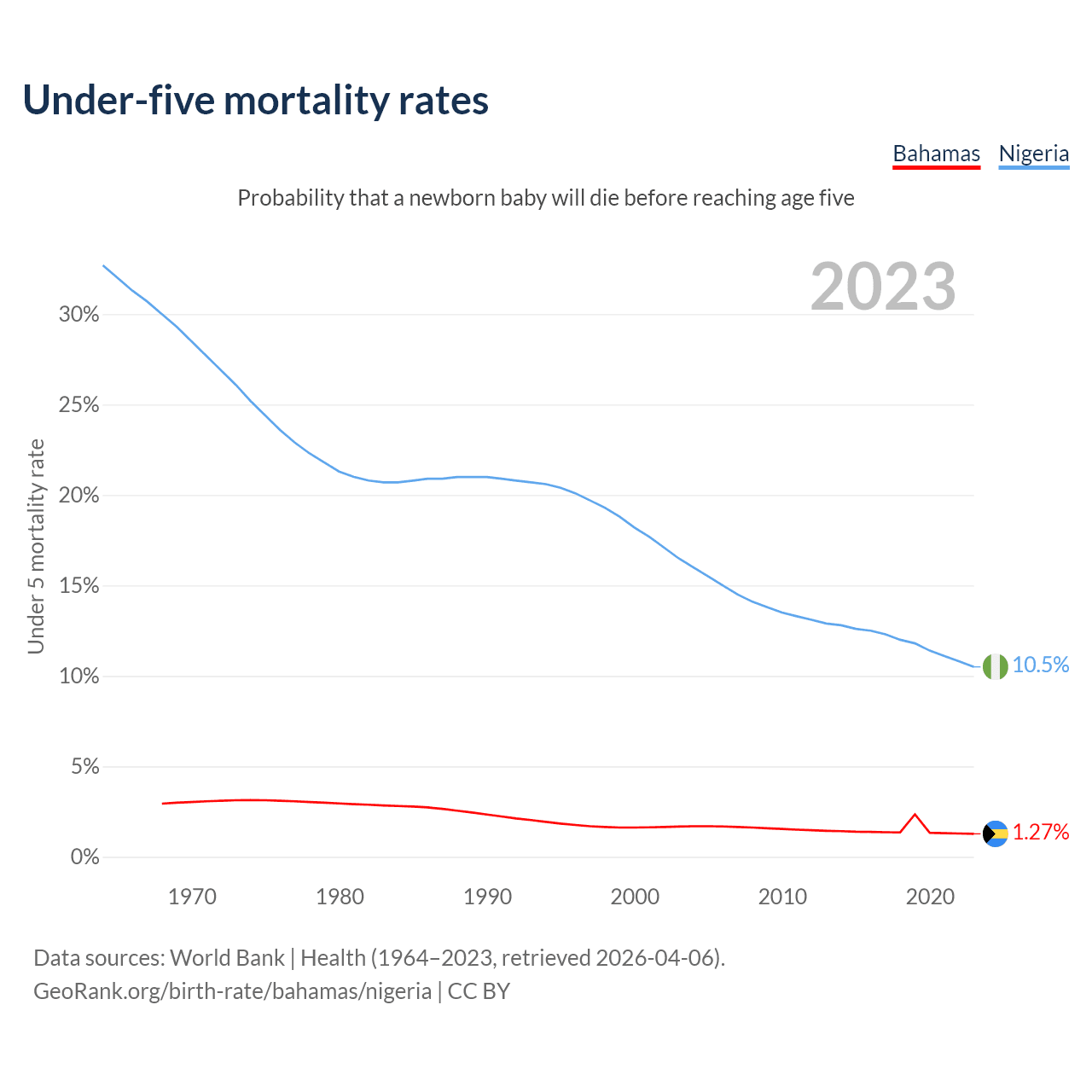 The chance that a newborn baby will die before reaching age five is 1.27% in the Bahamas and 10.5% in Nigeria. Above is a chart with historical data on under-five mortality rates.