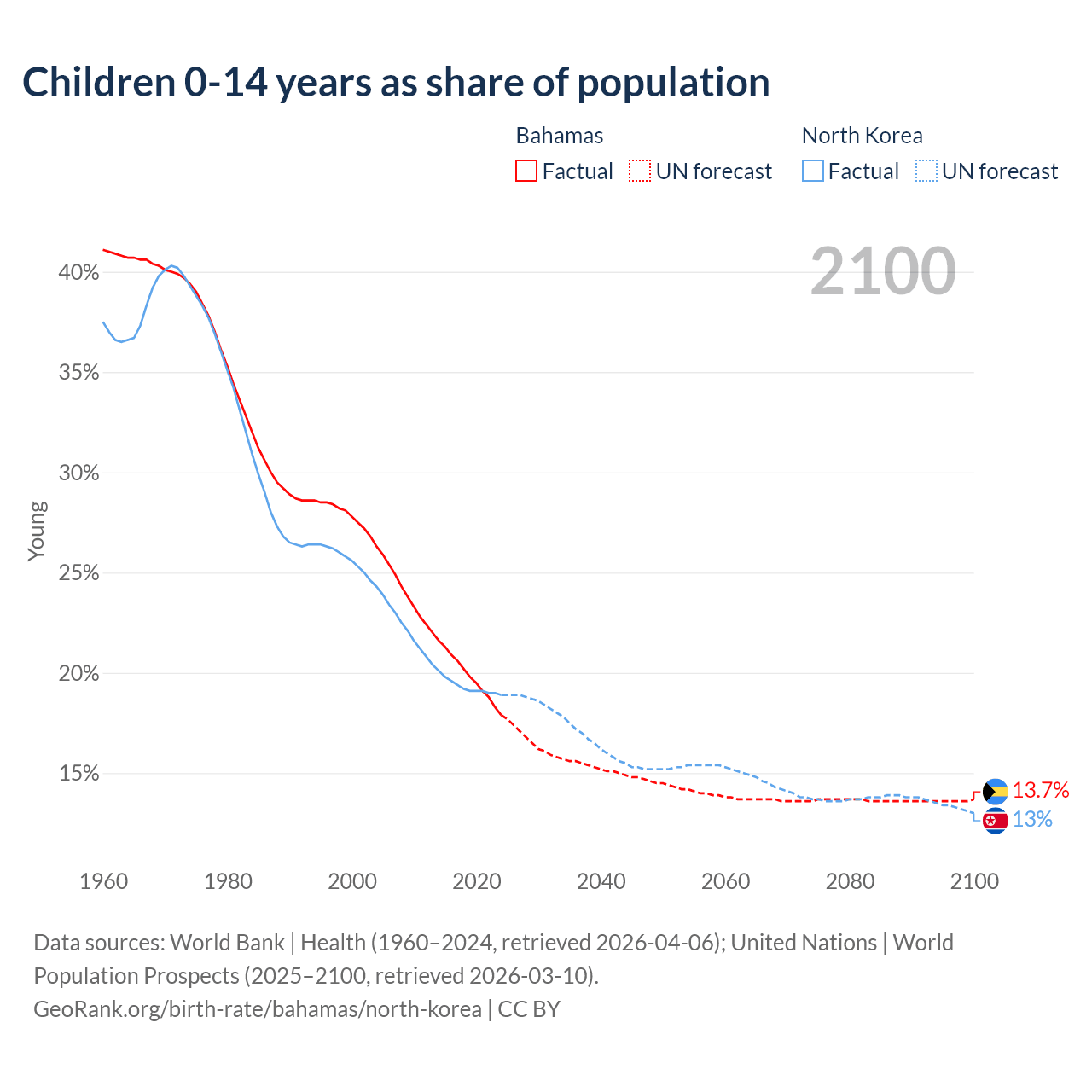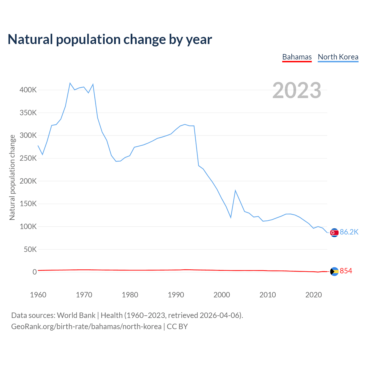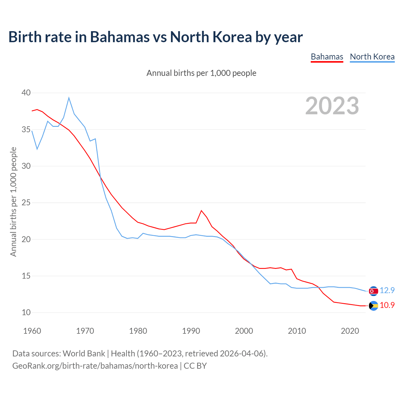 The Bahamas has an annual birth rate of 10.9 births per 1,000 people, compared to 12.9 for North Korea. The average number of children a woman is expected to have during her lifetime — the fertility rate, is 1.37 in the Bahamas and 1.78 in North Korea — 29.6% difference.