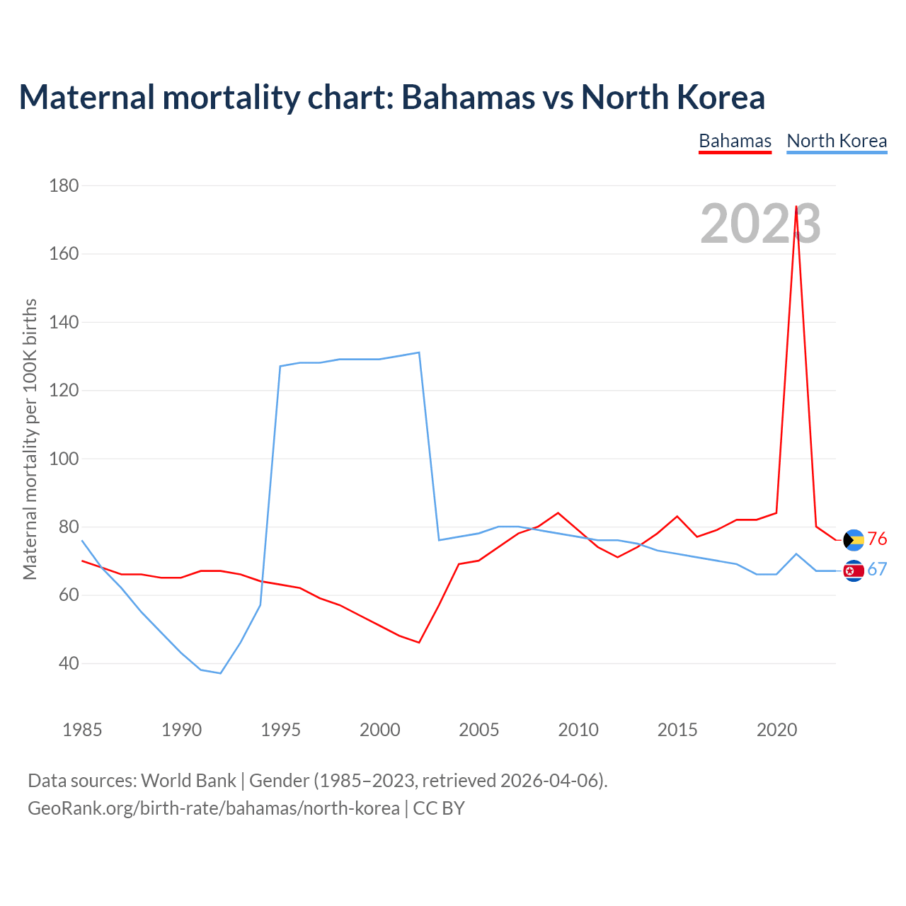 The maternal mortality rate, which is the probability of dying during childbirth or within 42 days of pregnancy termination, is 76 deaths per 100,000 live births in the Bahamas, compared to 67 deaths in North Korea.