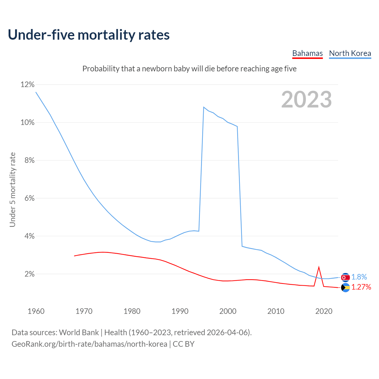 The chance that a newborn baby will die before reaching age five is 1.27% in the Bahamas and 1.8% in North Korea. Above is a chart with historical data on under-five mortality rates.