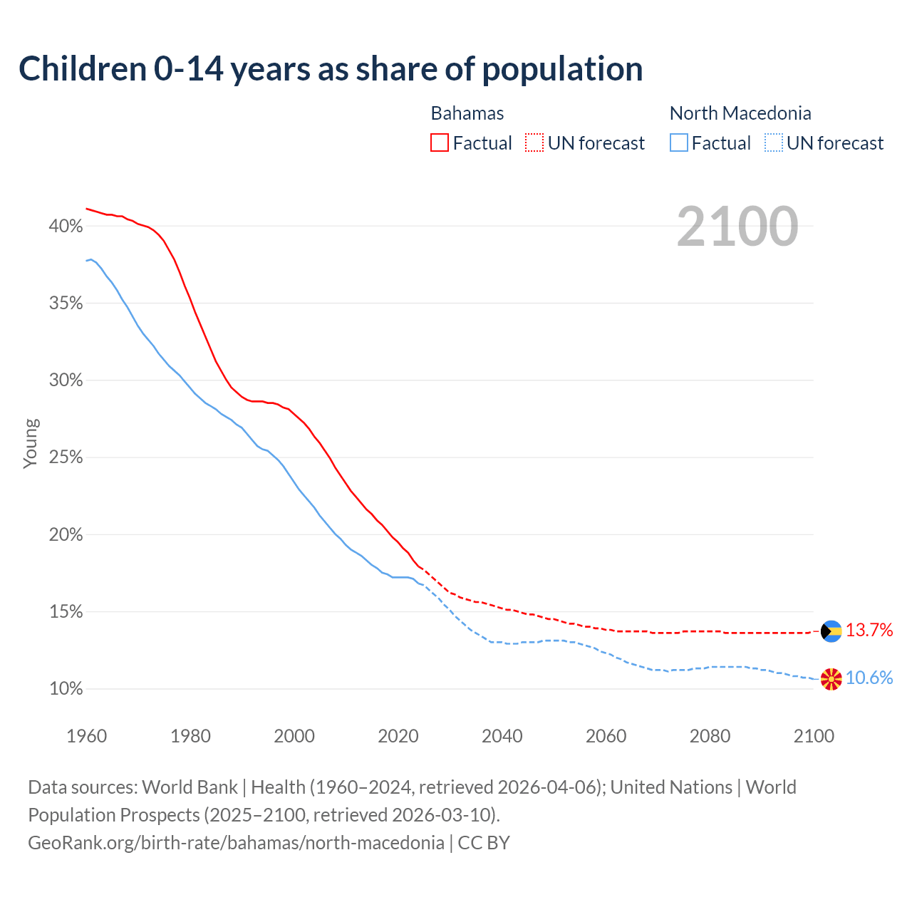 According to the latest available data on birth rates, the fertility rate in the Bahamas was 1.37 children per woman in 2023, compared to 1.5 in North Macedonia in 2023. The replacement level is considered to be 2.1 children per woman.