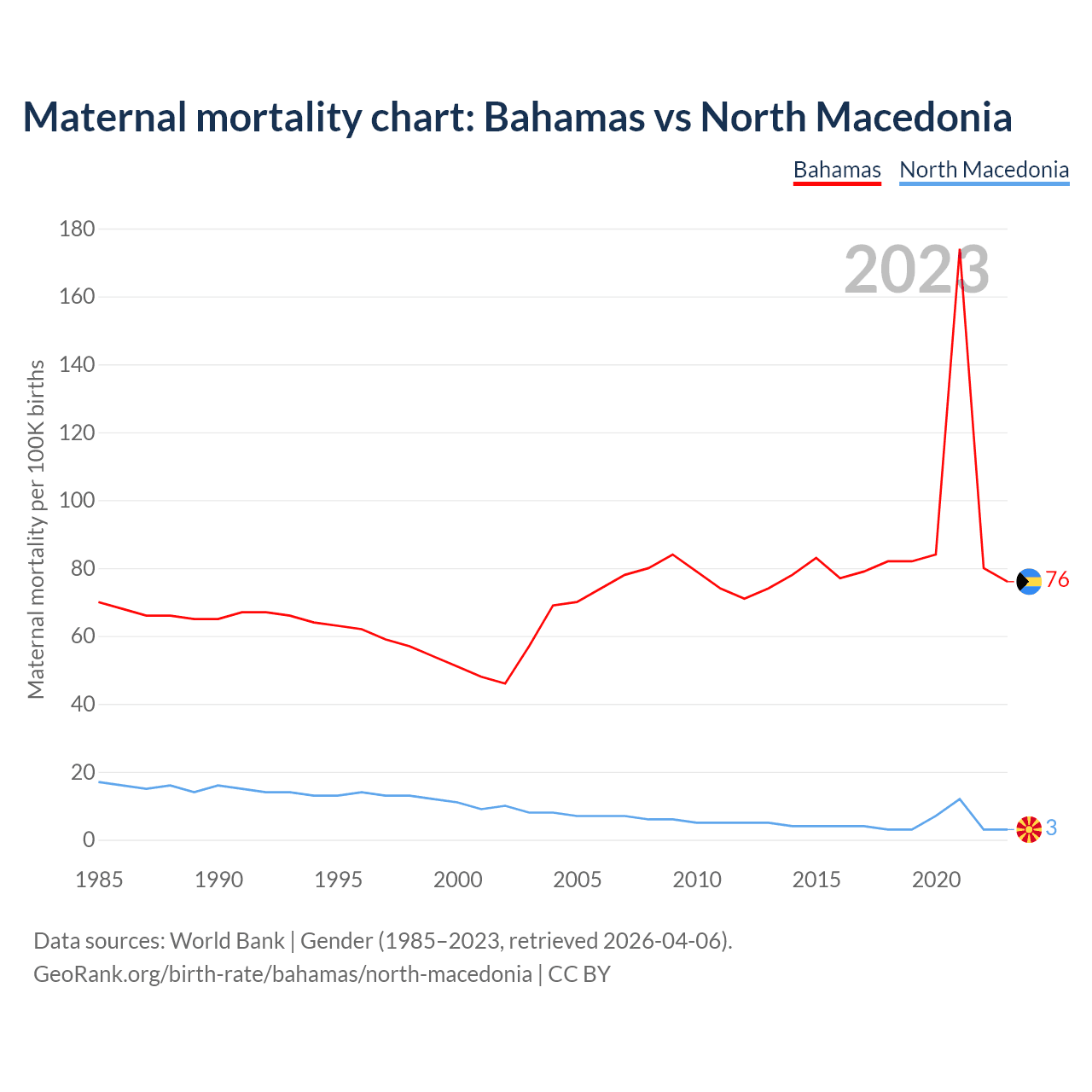 The maternal mortality rate, which is the probability of dying during childbirth or within 42 days of pregnancy termination, is 76 deaths per 100,000 live births in the Bahamas, compared to 3 deaths in North Macedonia.