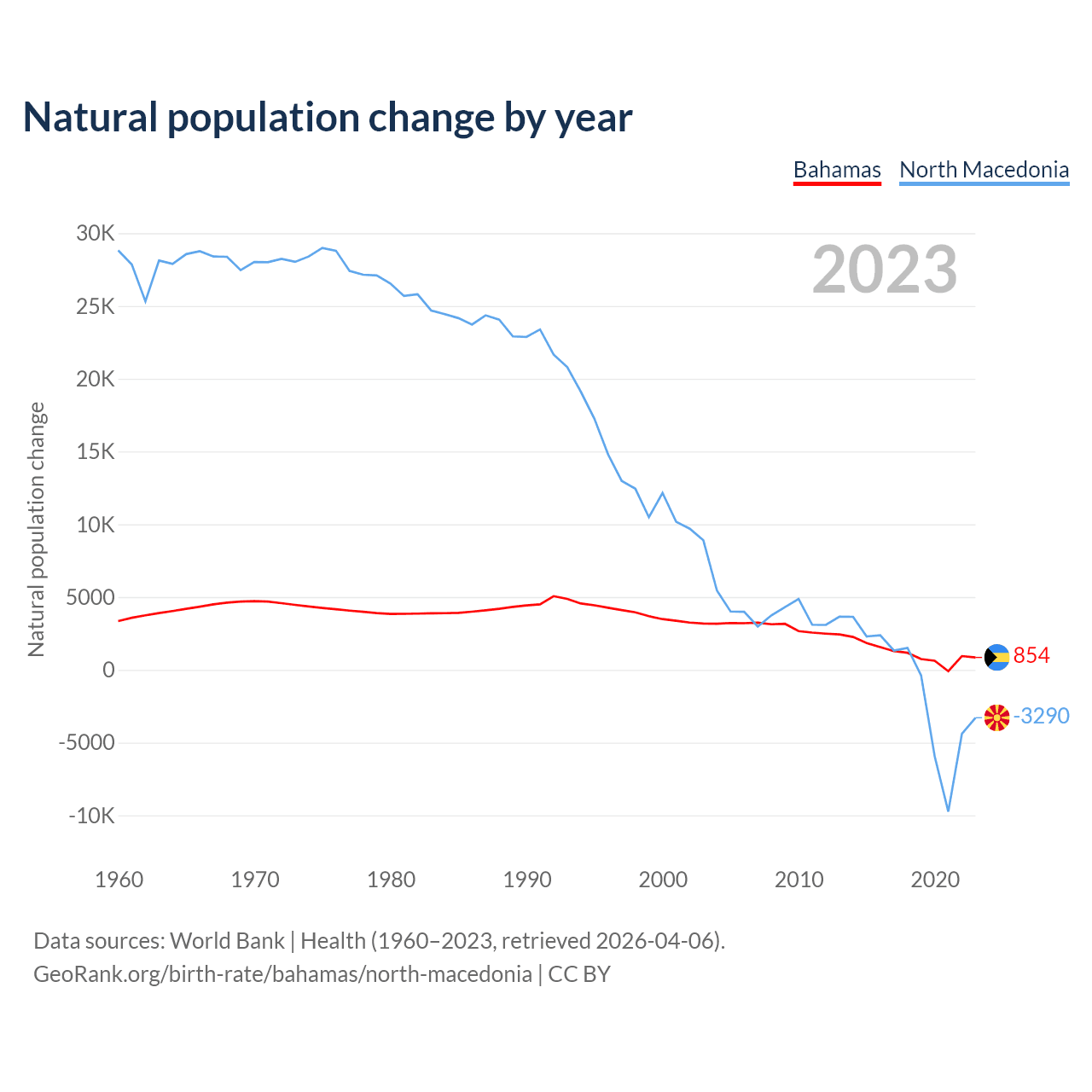 The Bahamas has an annual birth rate of 10.9 births per 1,000 people, compared to 9.2 for North Macedonia. The average number of children a woman is expected to have during her lifetime — the fertility rate, is 1.37 in the Bahamas and 1.5 in North Macedonia — 9.25% difference.